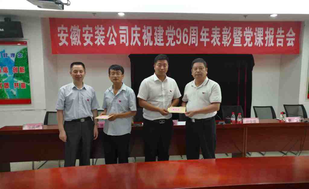 6月29日下午,安徽安裝公司召開慶祝建黨96周年表彰大會暨“七一”專題黨課活動,公司領(lǐng)導(dǎo)班子、在肥在崗黨員、入黨積極分子以及受表彰的先進(jìn)集體、先進(jìn)個人等60余人參加了會議。會議由公司董事長、總經(jīng)理、黨委副書記王軍邦主持。