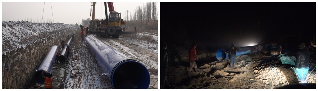 該工程是在野外長距離作業(yè),管道沿途需要穿過高速、省道、鐵路、亞歐光纜及眾多鄉(xiāng)村道路和田間陰溝,施工區(qū)域內有農田、戈壁、沙漠,沼澤等,自然環(huán)境極其惡劣,施工地質極為復雜。尤其在步入11月,新疆烏蘇市正式進入寒冬季節(jié),期間平均氣溫都在零下十度以下,并時常飛舞著雪花,由于晝夜溫差大,夜間項目上的氣溫更是達到零下二三十度,這給項目部施工帶來了嚴重挑戰(zhàn),但項目部員工沒有被惡劣的環(huán)境所嚇倒,他們“逢山開路、遇水搭橋”,努力克服各方面不利因素,合理安排施工進度計劃。全體職工發(fā)揚安徽建工人“特別能吃苦,特別能戰(zhàn)斗”的企業(yè)作風,在公司“大干60天”勞動競賽的正向激勵下,不畏環(huán)境艱苦,抓質量,保安全,戰(zhàn)荒漠,斗嚴寒,每天堅持戰(zhàn)斗在生產(chǎn)第一線,哪里有施工,哪里就有管理人員的堅定身影。