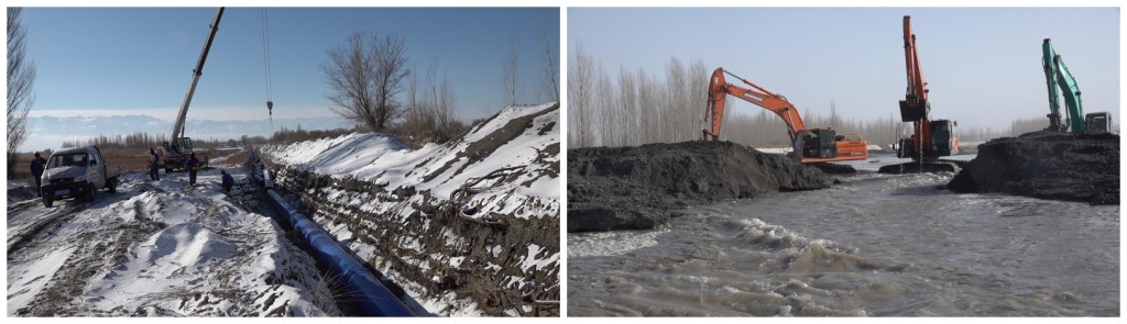 由于施工工期短,為了按時完成管道穿引洪渠任務,目前,在項目執(zhí)行經(jīng)理柴琳、項目副經(jīng)理張寶深以及項目技術負責人蔡京利的帶領下,項目部正在堅持24小時不間斷施工;除此之外,由于施工現(xiàn)場“戰(zhàn)線長”,距離附近集鎮(zhèn)和項目部基地都較遠,項目部在河渠邊搭建兩個軍用帳篷做為施工指揮部,“冷饃硬馕加泡面”成了項目部午餐“標配”。施工間歇,施工人員就在管溝邊用撿到的枯木點燃火堆取暖。在穿越四棵樹河施工段施工過程中,管溝挖深總共約4米,但管溝中的水深卻高達3米,由于管道安裝滿足標高要求,即使面臨開挖出水多,施工難度大的困境,項目副經(jīng)理馬讓同志依舊毫不猶豫地召集起項目上的黨員同志,帶頭穿上雨衣皮褲,站在挖機斗中下河扶塔尺測標高,保證管道安裝質量。他們的身影深深地感染著項目上的每一個人。在四棵樹河中管道施工時,需要將上游河水截流,時間緊任務重,項目全體員工不喊累不叫苦,沒日沒夜加班奮戰(zhàn),搶抓施工進度......