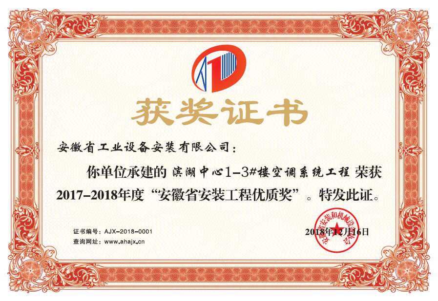 根據(jù)《中國(guó)安裝工程優(yōu)質(zhì)獎(jiǎng)(中國(guó)安裝之星)評(píng)選辦法》(安協(xié)〔2015〕19號(hào))、《關(guān)于開展“2017-2018 年度中國(guó)安裝工程優(yōu)質(zhì)獎(jiǎng)(中國(guó)安裝之星)第一批評(píng)選活動(dòng)”的通知》(安協(xié)〔2017〕7 號(hào))要求,協(xié)會(huì)做為我省推薦單位,組織專家對(duì)七個(gè)申報(bào)中國(guó)安裝工程優(yōu)質(zhì)獎(jiǎng)項(xiàng)目,進(jìn)行檢查驗(yàn)收,一致認(rèn)為,均代表我省安裝行業(yè)優(yōu)質(zhì)水平。為表彰先進(jìn),樹立標(biāo)桿,經(jīng)研究決定授予安徽省工業(yè)設(shè)備安裝有限公司“濱湖中心1-3#樓空調(diào)系統(tǒng)工程”等七項(xiàng)工程榮獲2017-2018年度“安徽省安裝工程優(yōu)質(zhì)獎(jiǎng)”。并在協(xié)會(huì)第七屆三次理事(擴(kuò)大)會(huì)議上通報(bào)表彰。協(xié)會(huì)希望各獲獎(jiǎng)單位珍惜榮譽(yù),再接再厲,繼續(xù)探索爭(zhēng)先創(chuàng)優(yōu)的經(jīng)驗(yàn),充分發(fā)揮示范引領(lǐng)作用,各協(xié)會(huì)會(huì)員單位要以獲獎(jiǎng)單位為榜樣,牢固樹立質(zhì)量第一意識(shí),多出精品,多創(chuàng)名品,為質(zhì)量強(qiáng)省,提質(zhì)優(yōu)效,轉(zhuǎn)型升級(jí)發(fā)展而努力。