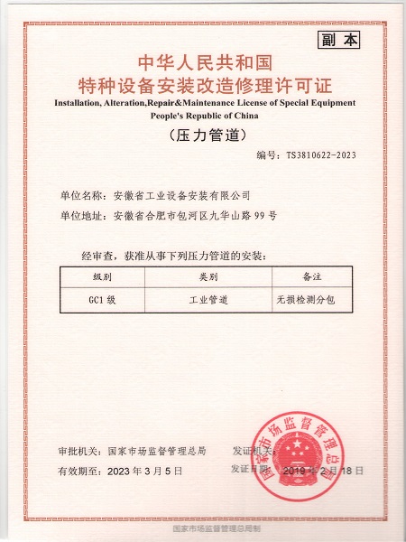 特種設(shè)備安裝改造維修許可證(壓力管道)