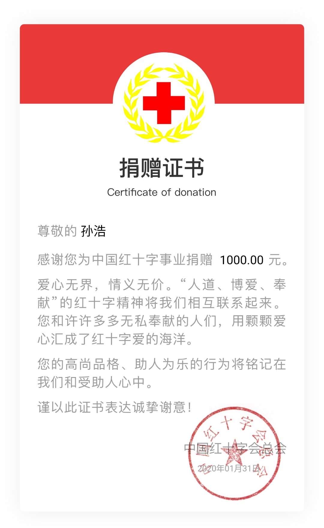 自新型冠狀病毒引發(fā)的肺炎疫情從湖北武漢爆發(fā)以來(lái),始終牽動(dòng)著眾人的心,更有不少愛(ài)心人士主動(dòng)奉獻(xiàn)愛(ài)心。1月31日,孫浩一家三口懷著對(duì)武漢疫區(qū)同胞深深的愛(ài),向中國(guó)紅十字會(huì)捐款抗擊疫情,以表達(dá)對(duì)武漢疫區(qū)人民的關(guān)愛(ài)。