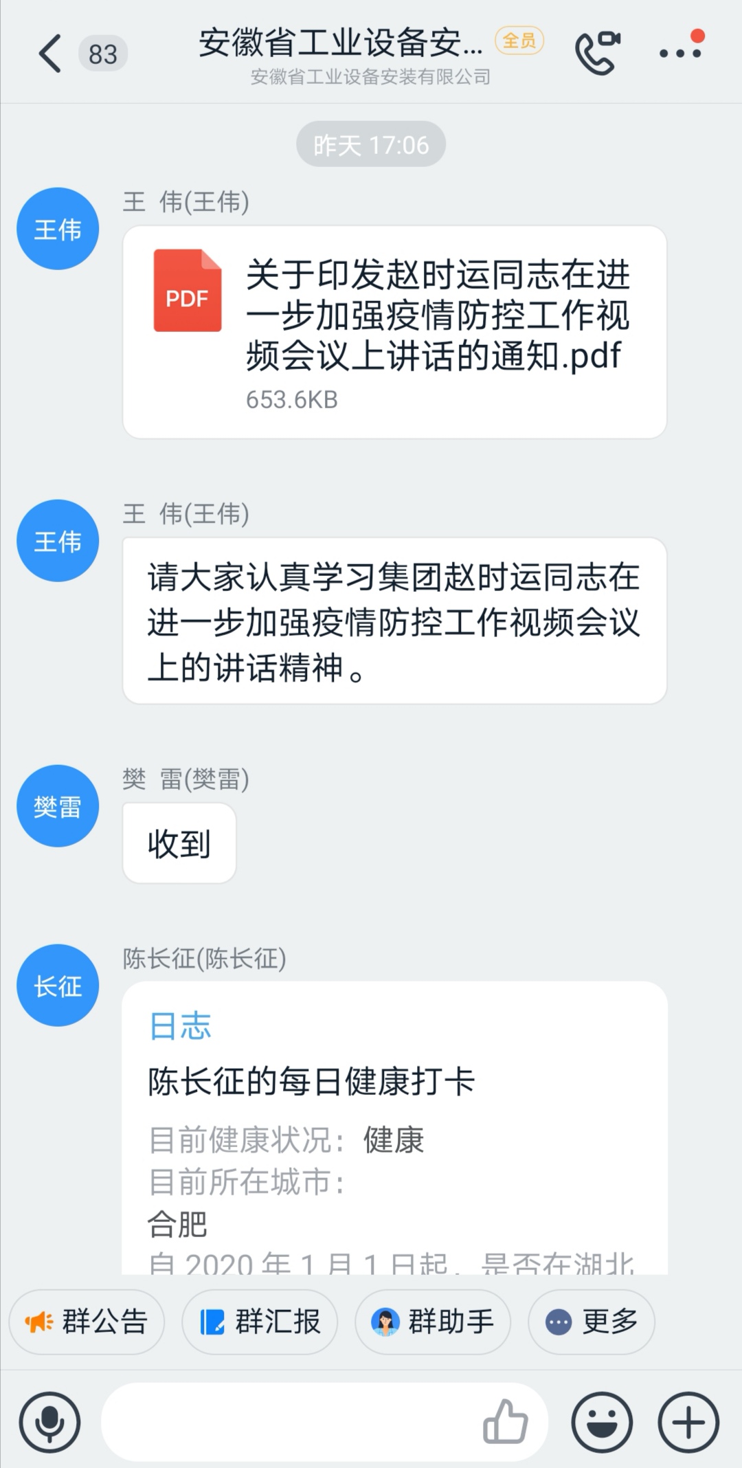 2月11日,安徽安裝公司通過釘釘日志、疫情防控群等網(wǎng)絡(luò)形式,迅速將《集團(tuán)公司黨委書記、董事長趙時運(yùn)在進(jìn)一步加強(qiáng)疫情防控工作視頻會議上的講話》精神,傳達(dá)到每名職工,做到人人皆知,認(rèn)真加以貫徹落實(shí)。
