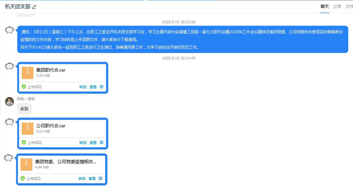 本次理論學(xué)習(xí)會(huì)為了縮短會(huì)議時(shí)間,采取集中學(xué)習(xí)與個(gè)人學(xué)習(xí)相結(jié)合的方式。會(huì)前已將學(xué)習(xí)材料分享至群文件,供大家自學(xué)查閱。會(huì)上全體團(tuán)員集中學(xué)習(xí)了安徽建工控股一屆七次職代會(huì)精神、安徽安裝第十六屆七次職代會(huì)精神及《安徽安裝公司關(guān)于切實(shí)做好復(fù)工復(fù)產(chǎn)前疫情防控工作的通知》文件精神。