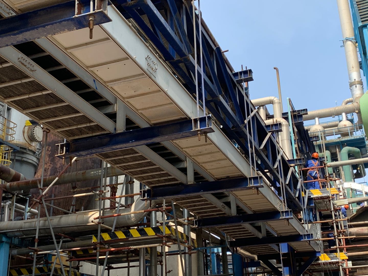 “Ⅰ、Ⅱ硫磺回收裝置增設(shè)煙氣后堿洗流程項(xiàng)目”是能使煙氣SO2排放濃度從原先的50mg/m3下降至≤10mg/m3的環(huán)保工程。但該項(xiàng)工程僅一個脫硫塔下段就高達(dá)33米,重達(dá)58噸,體積十分龐大,而現(xiàn)場存在作業(yè)場地狹小,固有障礙物多、吊重荷載大等諸多問題,無法將設(shè)備一次性運(yùn)至施工現(xiàn)場并進(jìn)行下段焊接梯子、平臺等附塔“穿衣戴帽”作業(yè)。對此,項(xiàng)目部多次優(yōu)化倒運(yùn)方案,提前合理部署,采用額定荷載分別為220噸和90噸的汽車吊實(shí)施雙機(jī)抬吊作業(yè)和專為公路橋梁設(shè)計(jì)使用的炮車運(yùn)輸,從而順利完成了倒運(yùn)工作。同時,為爭取時間,安排班組實(shí)行夜間倒班制,管理人員輪班制,為接下來的脫硫塔“穿衣戴帽”和上下段空中組對焊接作業(yè)爭取了寶貴時間。