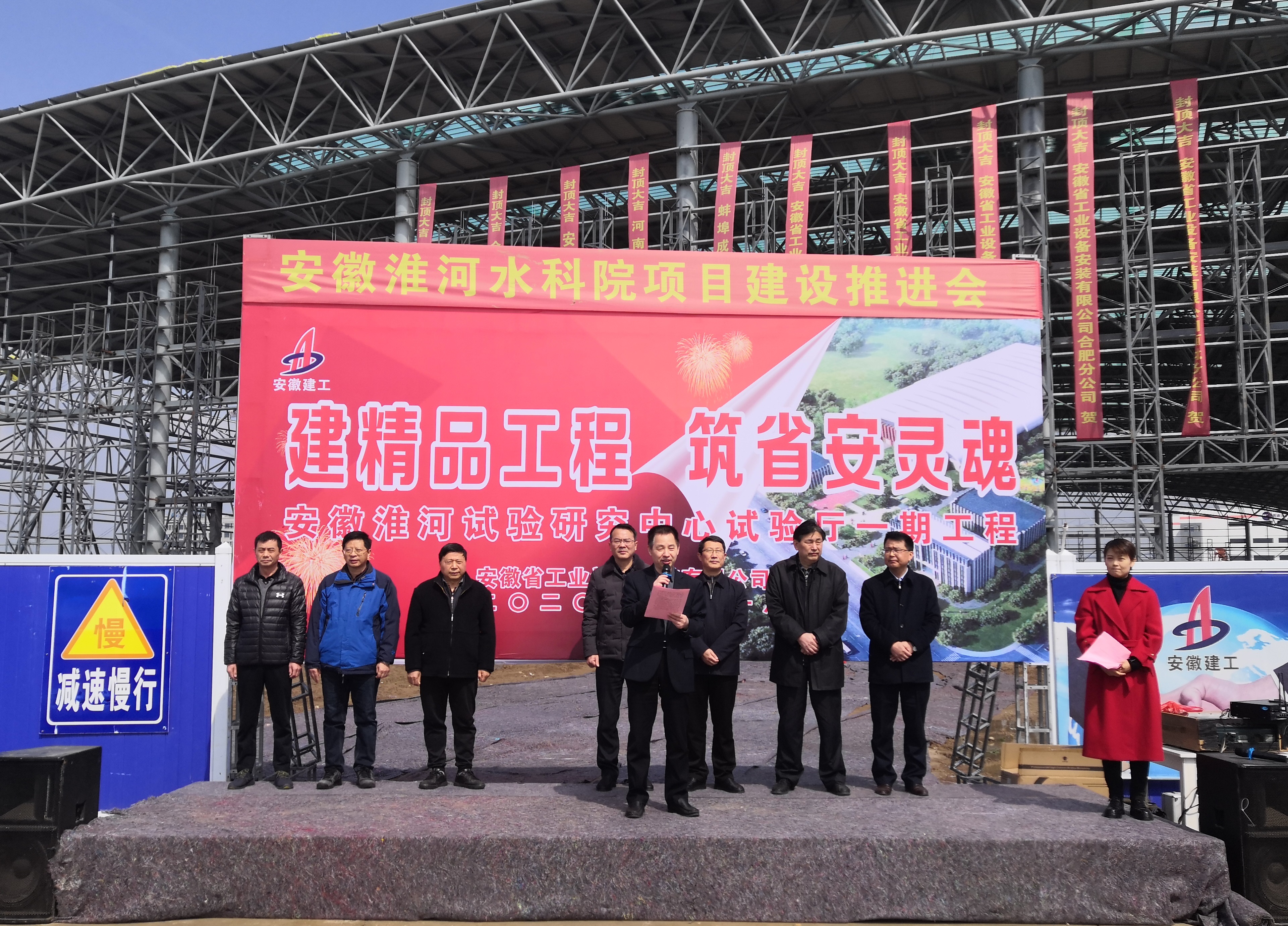 儀式現場,胡六中表示:安徽安裝始終秉承“創(chuàng)造空間藝術、成就人文生活”的企業(yè)使命,踐行“誠信為本、敬業(yè)至上”的企業(yè)核心價值觀,發(fā)揚“團結、拼搏、求實、創(chuàng)新”的企業(yè)精神,為社會各界客戶建設出一個又一個優(yōu)良工程。安徽省淮委水科院淮河試驗廳一期工程在參建各方人員的大力支持下,項目部堅持高標準、嚴要求,精心組織施工,科學安排生產,從項目開工就鼓足干勁,日夜兼程,精心組織,精心施工,搶晴天、拼雨天、頂烈日、抗酷暑、戰(zhàn)嚴冬、抗疫情,從最初172根長螺旋鉆孔樁樁基的施工,到成千噸鋼材切割、下料、拼裝、焊接,最后一排排鋼柱高高吊起,一榀榀桁架凌空對接,項目克服了難以盡述的困難和挫折。幾度耕耘,幾度風雨,幾番磨礪,幾番拼搏,順利實現主體結構封頂,取得了工程建設的階段性勝利。在后期的施工中,安徽安裝公司及項目部全體人員將以此為契機,再接再厲,繼續(xù)發(fā)揚“特別能吃苦,特別能戰(zhàn)斗”的優(yōu)良作風,一手抓生產,一手抓防疫,全力以赴完成好后續(xù)各項工作,嚴格施工管理,急業(yè)主所急,想業(yè)主所想,全面抓好工程質量、安全、進度,保質保量履行好合同義務,確保工程如期完工,盡心竭力把項目打造成為“優(yōu)質精品工程、業(yè)主滿意工程”,為珠城建設貢獻出一份力量。