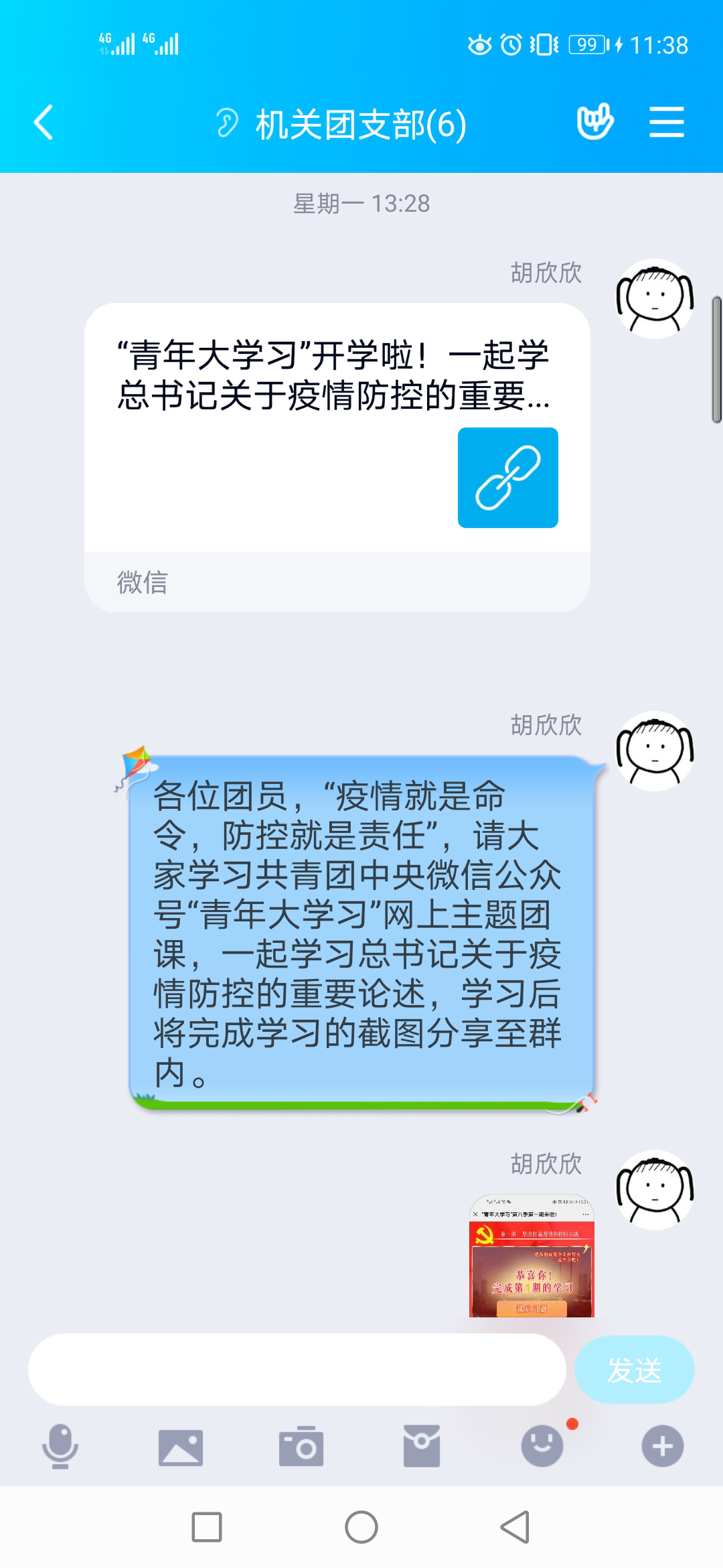 2月17日,共青團(tuán)中央“青年大學(xué)習(xí)”網(wǎng)上主題團(tuán)課第八季如期開學(xué),機(jī)關(guān)團(tuán)支部第一時(shí)間組織團(tuán)員青年進(jìn)行線上觀看,學(xué)習(xí)總書記關(guān)于疫情防控的重要論述。新冠肺炎疫情防控工作依然是當(dāng)前最重要一項(xiàng)任務(wù),將黨中央的精神學(xué)入腦、記在心,也是團(tuán)員青年的重要責(zé)任。