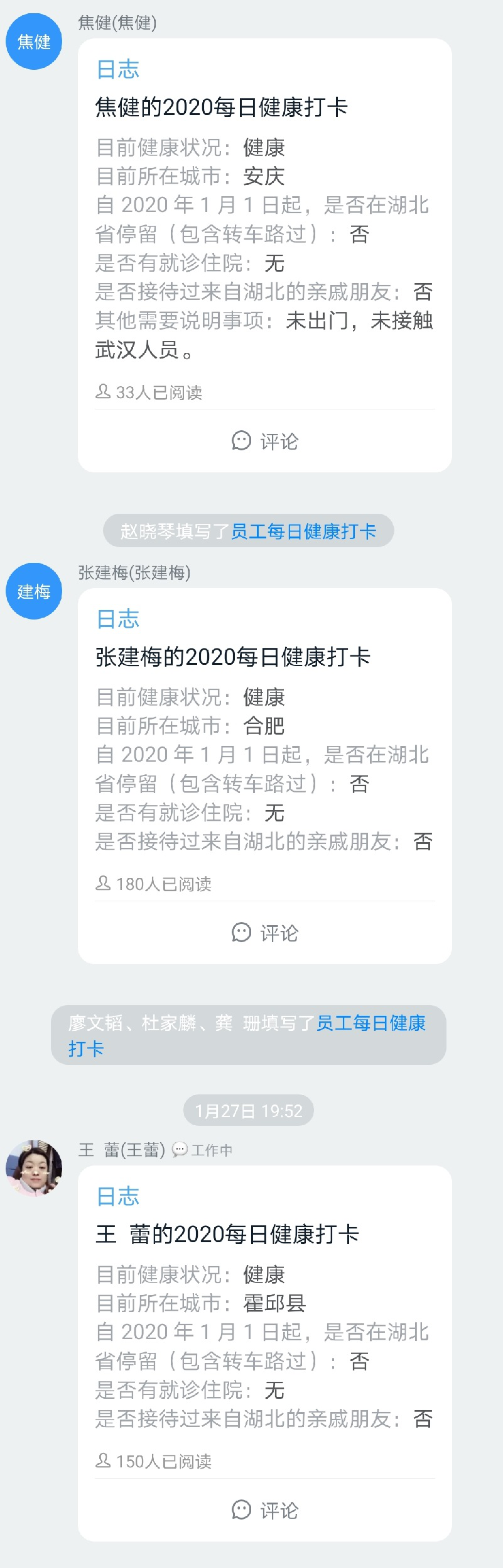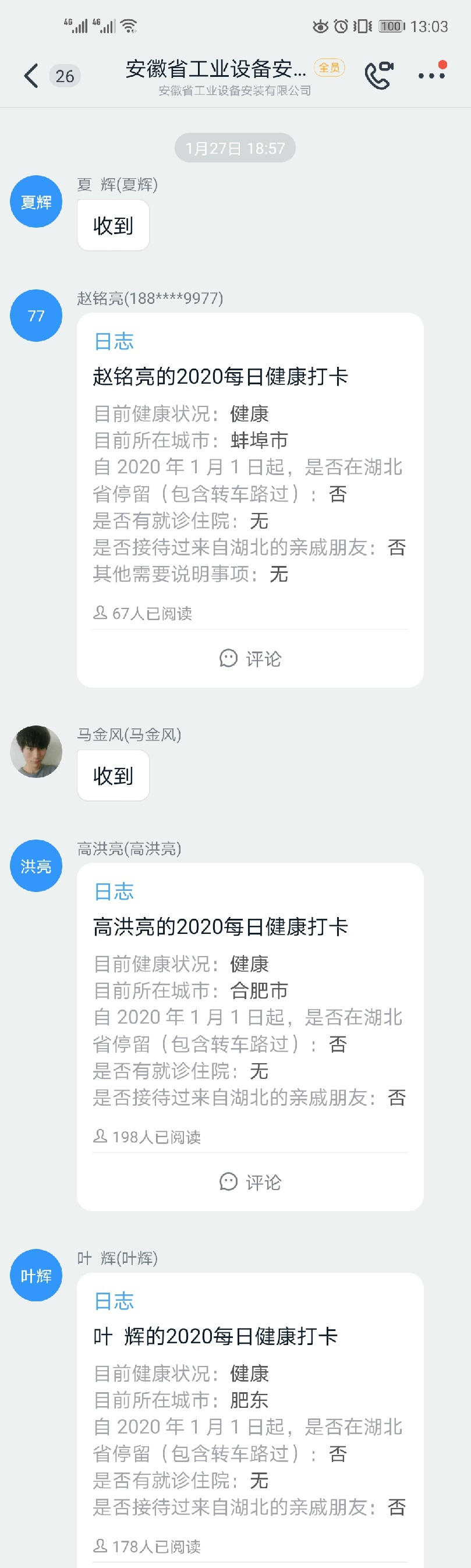 1月27日(大年初三),公司下發(fā)《安徽安裝公司關(guān)于做好新型冠狀病毒肺炎疫情工作的防控措施》,全體員工每日在釘釘日志專項(xiàng)報(bào)告當(dāng)日去向及身體狀況,各分公司、各部門認(rèn)真做好登記,確保信息及時(shí)準(zhǔn)確,時(shí)刻密切關(guān)注員工的身體健康狀況。