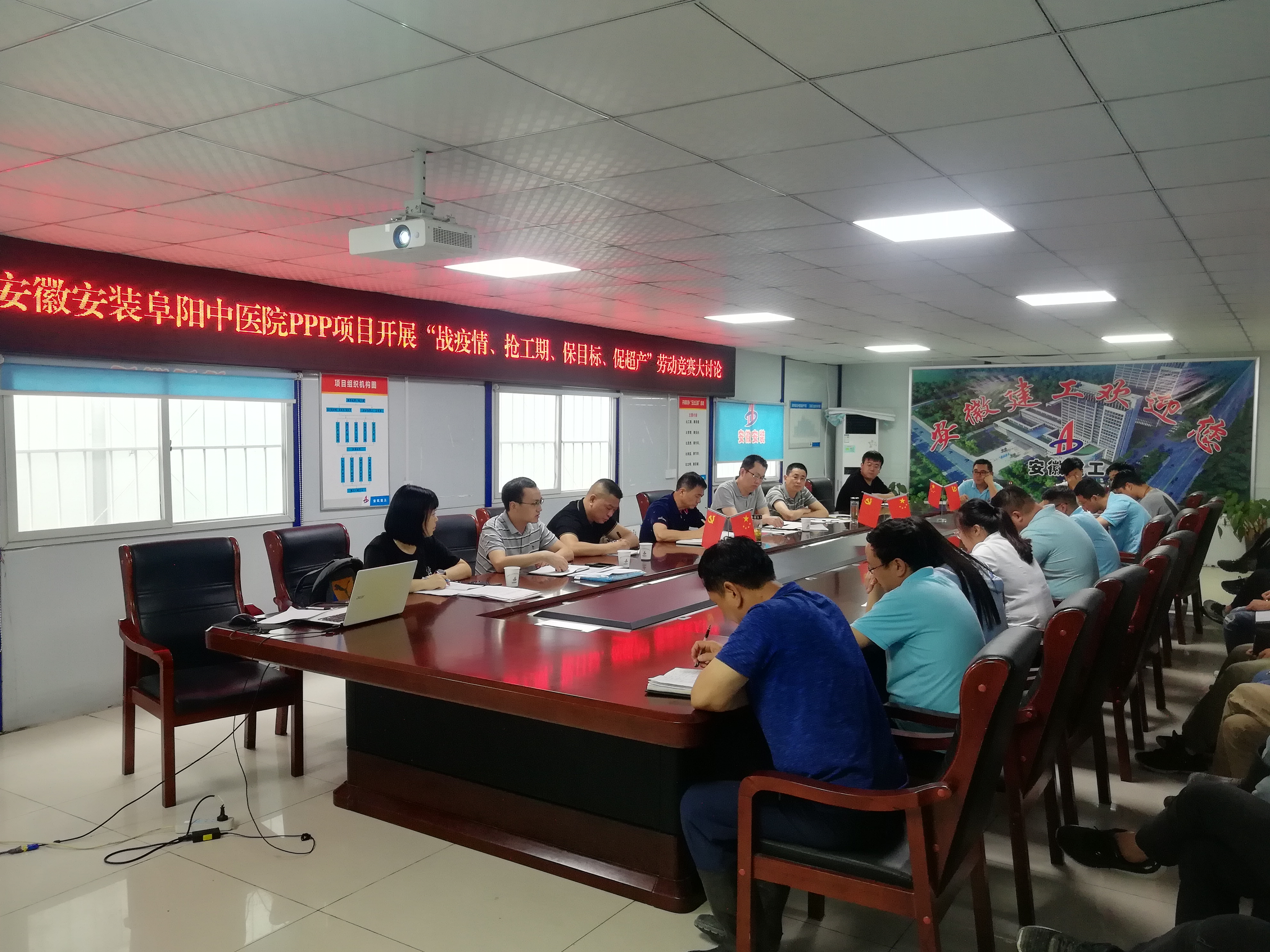 為認(rèn)真貫徹公司“戰(zhàn)疫情、搶工期、保目標(biāo)、促超產(chǎn)”勞動(dòng)競(jìng)賽活動(dòng)精神,7月12日下午,公司紀(jì)委書(shū)記、工會(huì)主席李寬旭,副總經(jīng)理王軍一行在阜陽(yáng)潁東中醫(yī)院建設(shè)PPP項(xiàng)目部會(huì)議室,組織開(kāi)展“戰(zhàn)疫情、搶工期、保目標(biāo)、促超產(chǎn)”勞動(dòng)競(jìng)賽大討論,分公司領(lǐng)導(dǎo)班子成員、項(xiàng)目部全體人員30余人參加了會(huì)議,會(huì)議由李寬旭主持。