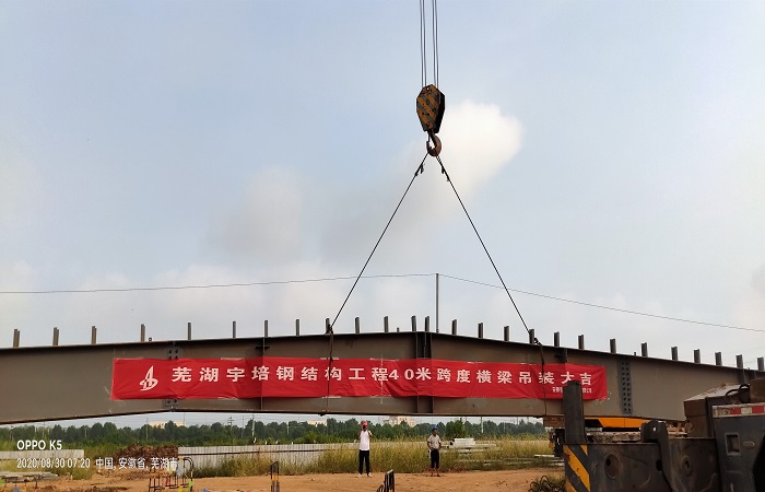 蕪湖宇培鋼結構項目露天跨部分為現場整體廠房連接點,同時也是連接PC1/PC2兩個廠房大跨度橫梁結構核心區(qū),包括21拼大跨度橫梁,此橫梁為蕪湖宇培項目鋼結構工程中重量最大的鋼構件,長度約為40米,最大寬度達1.5米,重量約10噸。露天跨部分的吊裝作業(yè),是本項目難度最大,精度要求最高的一項工程,特別是吊裝完善后橫梁與PC2號廠房的連接點采用高強螺栓連接,而另一端與PC1號廠房采用焊接擋板滾軸式連接,每跨橫梁在后期達到可以移動的效果。