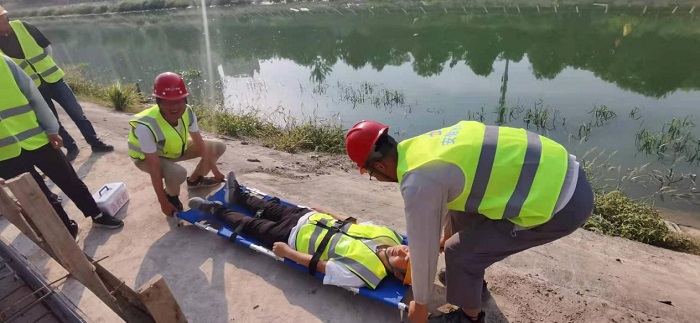 固鎮(zhèn)三八河景觀工程項目部根據(jù)本項目臨近水邊的作業(yè)特點開展了防溺水應(yīng)急救援演練,模擬現(xiàn)場人員發(fā)生溺水,項目部立即組織人力搶救上岸。立即清除口、鼻中的污泥、雜草,保持呼吸道通暢。并進(jìn)行胸外按壓及人工呼吸,120救護車及時到場后送往醫(yī)院搶救,通過防溺水演練增強了項目部全體員工遇到緊急情況時的應(yīng)變能力和實際操作救援處置能力。