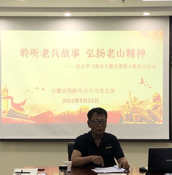 為深入開(kāi)展黨史學(xué)習(xí)教育活動(dòng),進(jìn)一步引導(dǎo)黨員干部學(xué)習(xí)黨史、銘記黨史,5月21日下午,蚌埠分公司黨支部組織開(kāi)展了一場(chǎng)“聆聽(tīng)老兵故事 弘揚(yáng)老山精神”黨史學(xué)習(xí)教育專(zhuān)題黨課暨主題黨日活動(dòng)。邀請(qǐng)?jiān)鴧⒓舆^(guò)對(duì)越自衛(wèi)反擊戰(zhàn)的退伍老兵,分公司在職員工年飛同志為大家上了一堂別開(kāi)生面的黨課。分公司班子成員、項(xiàng)目經(jīng)理、部門(mén)負(fù)責(zé)人及全體黨員參會(huì)。