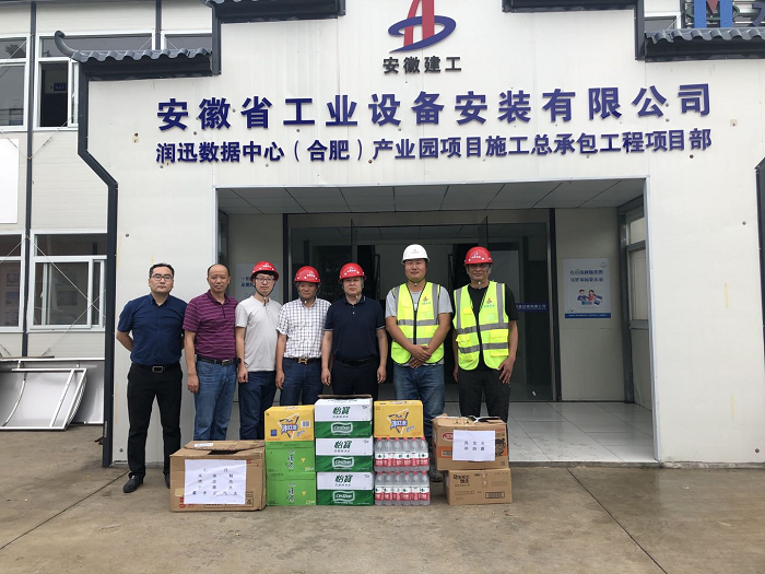 烈日炎炎,酷暑難當(dāng),6月16日,房建(裝飾)分公司黨支部書(shū)記王偉攜分公司工程管理部來(lái)到潤(rùn)迅數(shù)據(jù)中心(合肥)產(chǎn)業(yè)園項(xiàng)目,看望和慰問(wèn)奮戰(zhàn)在一線的員工,為他們送去仁丹、藿香正氣口服液、十滴水、飲料、藥品等防暑降溫物品,實(shí)地察看了項(xiàng)目工地和職工生活區(qū),并與項(xiàng)目同志進(jìn)行了座談交流。