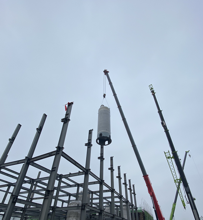 十余噸的罐體在吊車的牽引下緩緩升起,小心翼翼,精準(zhǔn)前往指定基礎(chǔ),施工人員進(jìn)行固定矯正...30多臺(tái)工業(yè)用罐就這樣矗立起來。