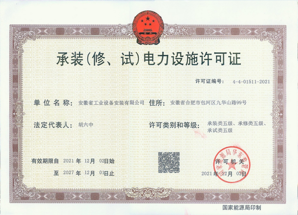 近日,安徽安裝公司申報的承裝(修、試)電力設(shè)施許可證資質(zhì)成功獲批。