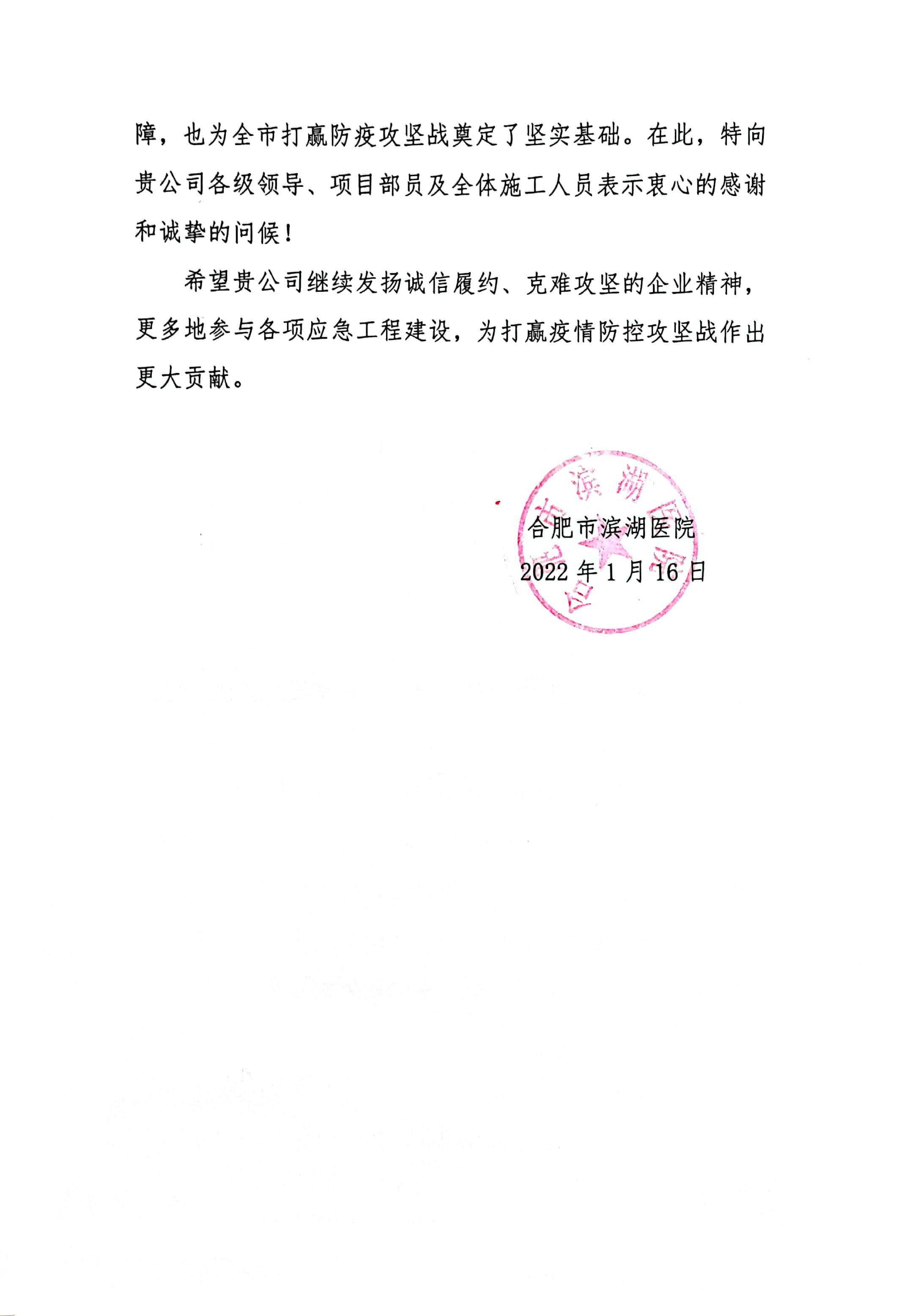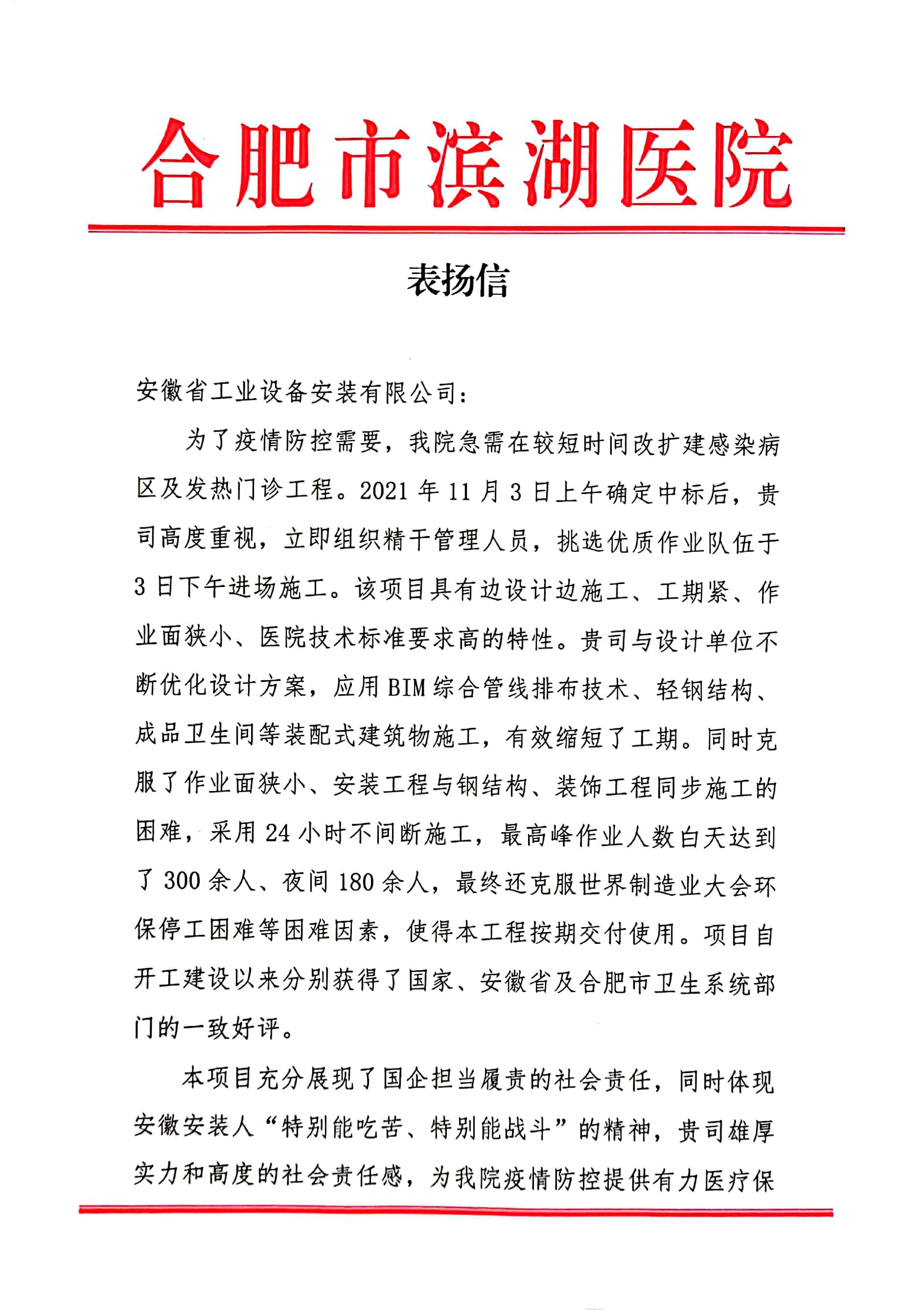 近日,安徽安裝公司收到合肥市濱湖醫(yī)院表揚信,信中高度贊揚公司濱湖醫(yī)院感染病區(qū)及發(fā)熱門診應(yīng)急改造工程設(shè)計施工一體化方艙醫(yī)院項目克服重重困難,縮短工期,一個月的時間內(nèi)按期交付使用。該項目充分展現(xiàn)了安徽安裝作為國有企業(yè)擔(dān)當(dāng)履責(zé)的社會責(zé)任,為合肥市打贏防疫攻堅戰(zhàn)奠定了堅實基礎(chǔ)。