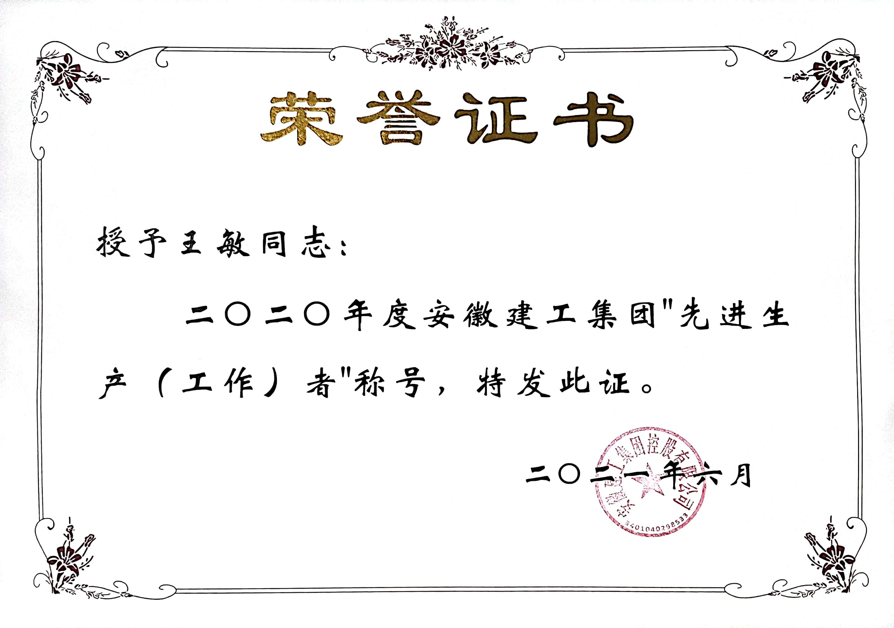 在工作作風(fēng)上,王敏一貫堅持對自己高標準嚴要求,腳踏實地,勤奮敬業(yè),認真細致,勤于思考,盡心盡責,主動、積極地做好每一項工作,認真履行崗位職責。她時常告誡自己要以德服人,以身作則,并在實際工作中努力實踐著這一思想 ,注重自己的一言一行,公正、客觀,一切從大局出發(fā),不謀私利,不圖己便,廉潔自律,做到自重、自省、自警和自勵。2021年,王敏由于出色的工作成績,被評為“安徽建工集團2020年度先進生產(chǎn)(工作)者”,她說,這是集團對她過去工作的肯定,也是對她未來工作的要求。