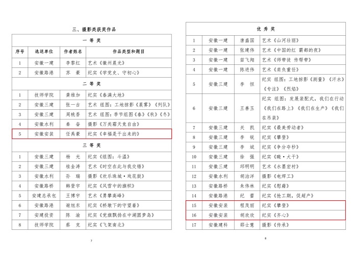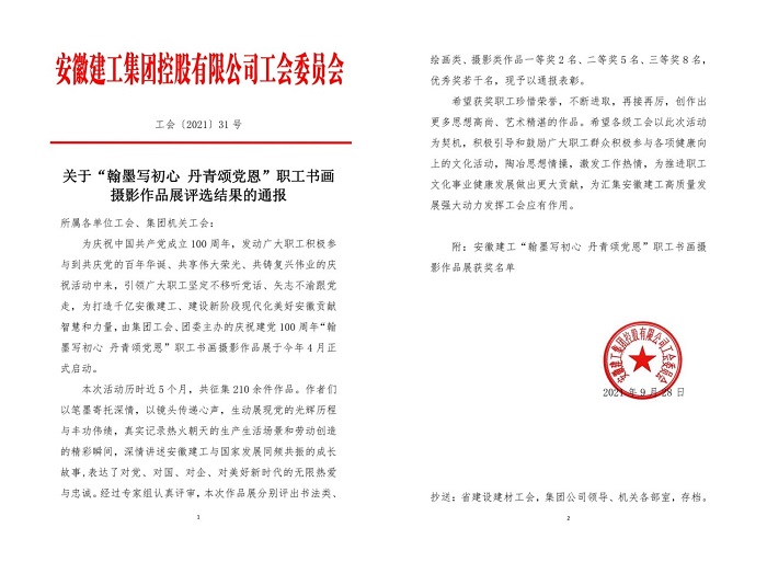 9月29日,集團(tuán)公司工會(huì)通報(bào)了“翰墨寫初心 丹青頌黨恩”職工書畫攝影作品展評(píng)選結(jié)果,安徽安裝公司選送的五幅作品榜上有名。其中馬金鑫的油畫作品《支部建在項(xiàng)目上》榮獲繪畫類一等獎(jiǎng),任禹豪的攝影作品《幸福是干出來(lái)的》榮獲攝影類二等獎(jiǎng),化范寶的硬筆書法作品《沁園春·雪》和程茂麗的攝影作品《攀登》、胡欣欣的攝影作品《齊心》分別榮獲書法類優(yōu)秀獎(jiǎng)和攝影類優(yōu)秀獎(jiǎng)。
