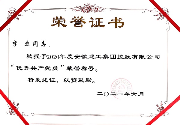 作為一名共產(chǎn)黨員,他處處以黨員的標(biāo)準(zhǔn)嚴(yán)格要求自己,聯(lián)系群眾和遵紀(jì)守法等各方面都較好的發(fā)揮著共產(chǎn)黨員的先鋒模范作用,得到領(lǐng)導(dǎo)和同事們的一致好評(píng),榮獲2020年度“建工集團(tuán)年度優(yōu)秀共產(chǎn)黨員”稱號(hào)。