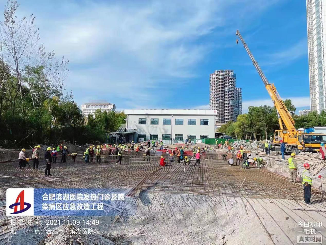 項(xiàng)目合同價(jià)2976萬元,要求12月7日完成施工,交付醫(yī)院使用。面對(duì)工期緊、任務(wù)重、場(chǎng)地小的壓力,項(xiàng)目部不畏困難,自11月4日進(jìn)場(chǎng)施工以來,采取人員幾班倒的工作方式,24小時(shí)不停工,短短幾天已經(jīng)完成原發(fā)熱門診1號(hào)樓的搬遷、拆除工作,新建發(fā)熱門診1號(hào)樓的基礎(chǔ)開挖、土方外運(yùn)、基礎(chǔ)底板鋼筋綁扎、支模、底板內(nèi)部水電預(yù)埋等工作。
