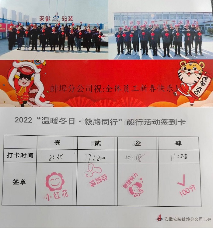 為展示安徽安裝蚌埠分公司員工積極向上的精神風(fēng)貌,倡導(dǎo)健康環(huán)保的生活理念,1月20日上午,分公司工會(huì)舉辦了一場(chǎng)主題為“溫暖冬日 毅路同行”的徒步毅行活動(dòng),分公司50余名員工參加活動(dòng)。