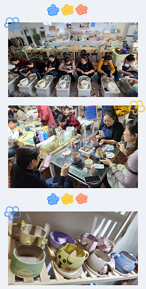 活動開始,大家一起參觀了各種各樣、富有特色的陶藝作品,使大家對“陶藝”產(chǎn)生了濃厚的興趣。首先陶藝?yán)蠋煘榇蠹抑v解了制作過程以及注意事項,并演示了捏壓、拉胚、修胚、上色等制作陶藝的步驟。在老師的精心指導(dǎo)下,大家先從一塊無固定形狀的土坯泥塊開始,進(jìn)行練泥、拉坯,只見放置在轉(zhuǎn)盤中心的泥團(tuán),隨手法的屈伸收放,不同形狀的杯子在大家的手中被創(chuàng)造出來。隨后大家用專用顏料在陶體上畫上自己心儀的圖案和彩繪,不一會兒,陶泥像被賦予了新的生命一般,一朵朵花,一只只小動物都躍然于陶藝素胚杯上,原本樸素的陶藝作品頓時活靈活現(xiàn)。最終一件件獨具匠心的陶藝作品,展現(xiàn)在大家面前,大家都十分期待早日拿到經(jīng)過上釉和燒制后親手制作的作品。