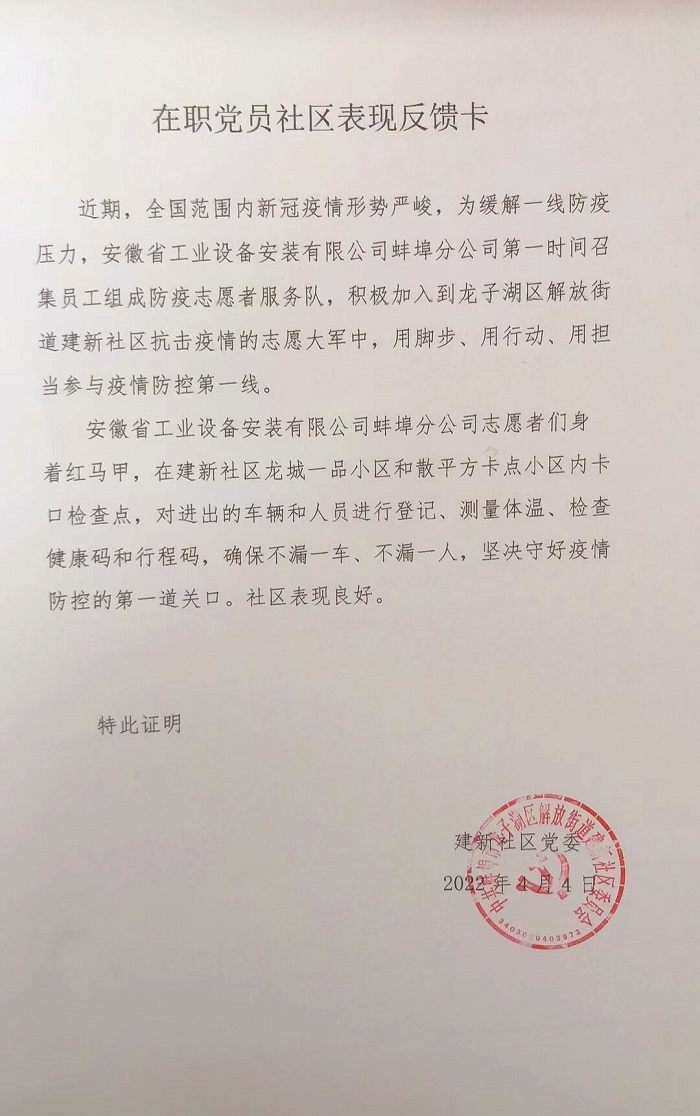 通過本次活動,志愿者們用實際行動踐行了初心和使命,展現(xiàn)了安徽安裝志愿者飽滿的精神風(fēng)貌。建新社區(qū)黨委表達了對于安徽安裝公司的真誠感謝,期間社區(qū)及時通過微信公眾號對安徽安裝積極擔(dān)當(dāng)社會責(zé)任予以報道,有效擴大了企業(yè)影響力,樹立了良好企業(yè)形象。