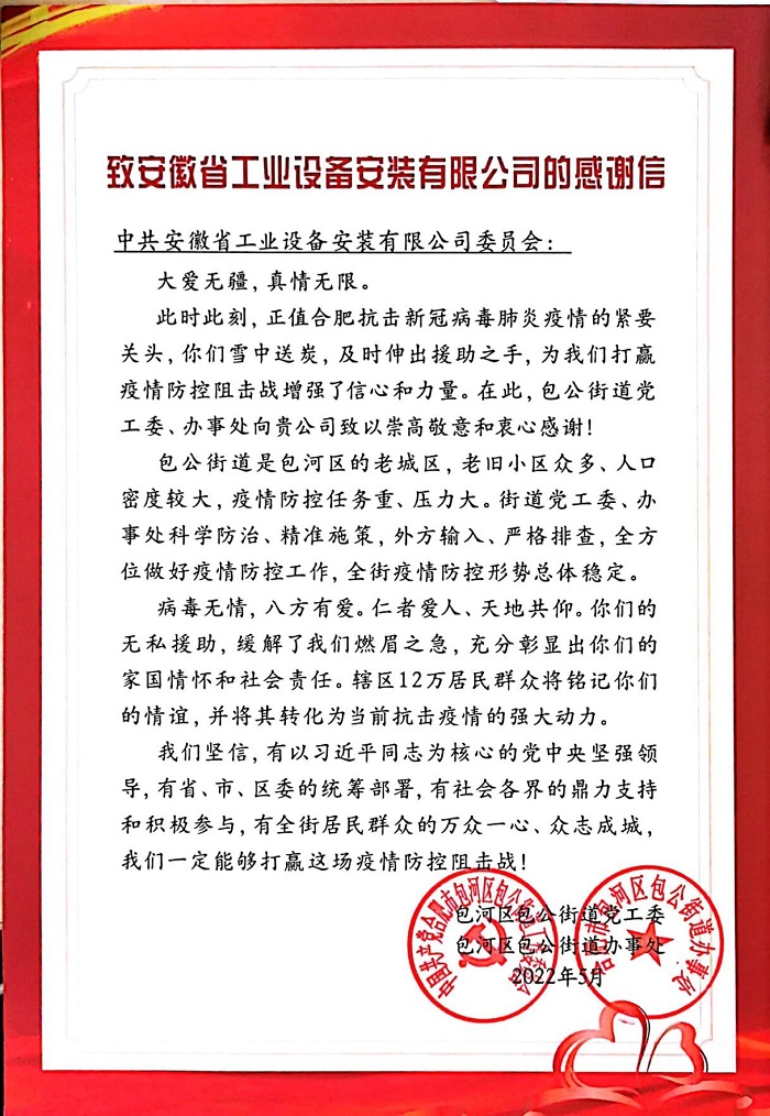 近日,包河區(qū)包公街道街道黨工委委員,辦事處副主任劉亮,包河區(qū)包公街道炳輝社區(qū)黨委書記房磊給安徽安裝公司送來了感謝信,信中表達了對安徽安裝公司在合肥抗擊新冠病毒肺炎疫情急要關頭迎難而上、勇于擔當,積極支援疫情防控的感激之情。