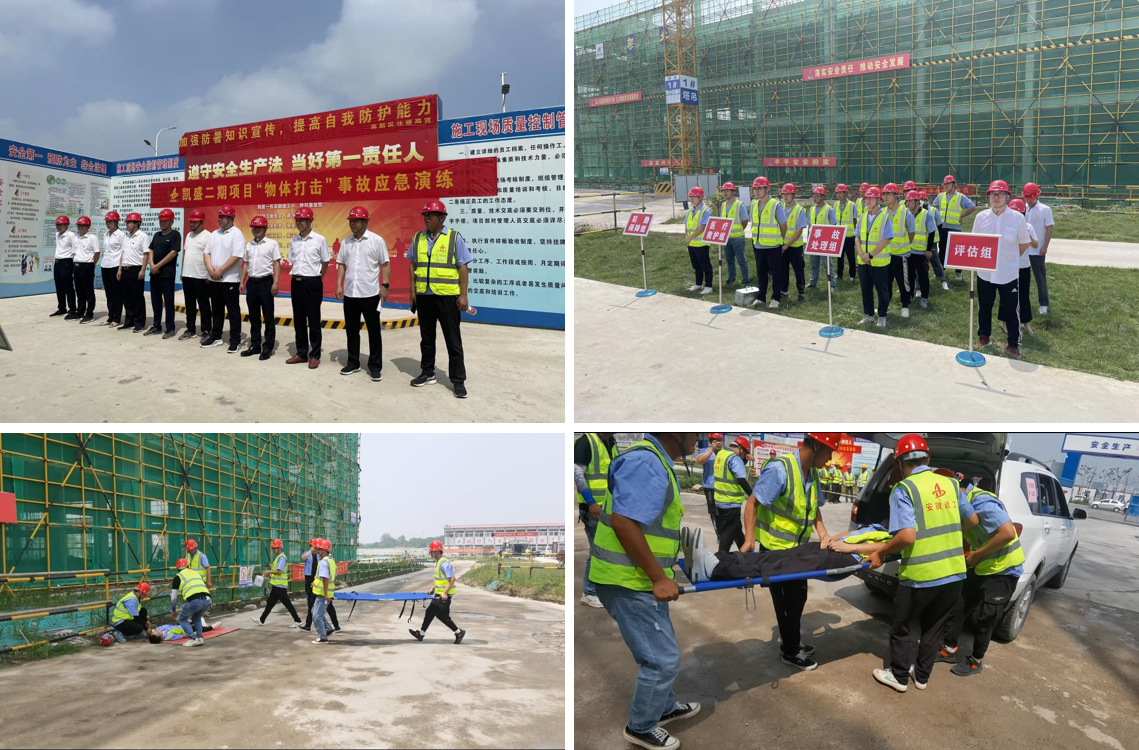 為了落實(shí)公司、分公司安全生產(chǎn)月的各項(xiàng)活動(dòng)部署,進(jìn)一步提升施工現(xiàn)場人員的安全防范意識(shí)及應(yīng)急救援處置能力,6月20日上午10點(diǎn),蚌埠分公司、房建(裝飾)分公司在凱盛科技超薄柔性玻璃二期項(xiàng)目施工現(xiàn)場聯(lián)合開展了“物體打擊”事故應(yīng)急救援演練活動(dòng),公司安全管理部副經(jīng)理蔣秀正、蚌埠分公司領(lǐng)導(dǎo)班子成員、房建(裝飾)分公司領(lǐng)導(dǎo)班子成員、監(jiān)理單位代表、項(xiàng)目人員共30余人參加演練。