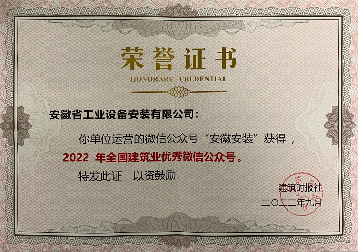9月25日,由建筑時(shí)報(bào)社主辦的2022年建筑業(yè)微信公眾號(hào)運(yùn)維經(jīng)驗(yàn)交流研討會(huì)暨全國(guó)建筑業(yè)優(yōu)秀微信公眾號(hào)頒獎(jiǎng)典禮在武漢召開。公司微信公眾號(hào)“安徽安裝”榮獲“2022年全國(guó)建筑業(yè)優(yōu)秀微信公眾號(hào)”榮譽(yù)。
