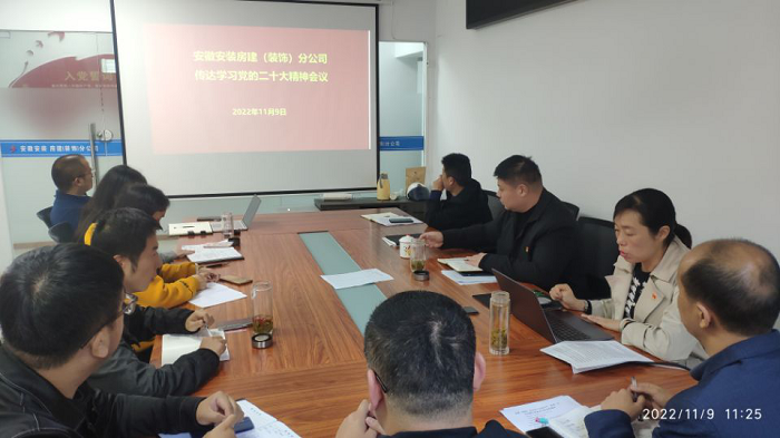 11月9日上午,房建(裝飾)分公司黨支部組織全體黨員、機關(guān)干部職工、在肥項目經(jīng)理召開學(xué)習(xí)宣貫黨的二十大精神專題會議。會議由支部書記程茂麗主持。