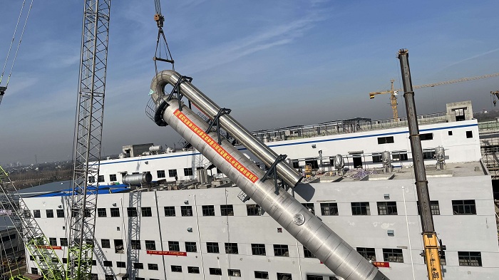 12月20日上午,安徽安裝合肥分公司承攬的蕪湖普立思生物科技有限公司聚乳酸及公用工程安裝項目丙交酯車間精餾塔一次性吊裝成功。