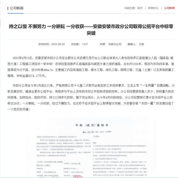 開拓市場取得突破。今年以來,分公司積極采取參與集團(tuán)內(nèi)部產(chǎn)業(yè)鏈專業(yè)分包競標(biāo)和外部公招項(xiàng)目投標(biāo)雙向并舉的方式拓展市場,打開經(jīng)營局面,連續(xù)承接了蜀山區(qū)體育公園項(xiàng)目安裝工程等多個(gè)項(xiàng)目。同時(shí)積極參與合肥市公招平臺(tái)投標(biāo),8月份一舉中標(biāo)廬江縣新建立人路(福泉路-城西大道)工程施工項(xiàng)目,中標(biāo)金額3274.17萬元,取得公招投標(biāo)零的突破。