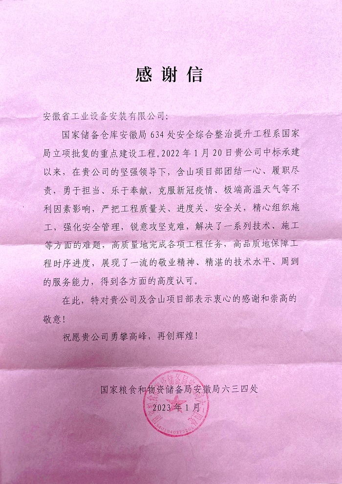 近日,安徽安裝合肥分公司收到業(yè)主方國家糧食和物資儲備局安徽局六三四處的感謝信,對公司“國家儲備倉庫安徽局634處安全綜合整治提升工程”克服諸多困難,精心組織,科學管理,高質(zhì)量完成工程施工任務的突出成績給予高度贊揚,并表達了由衷感謝。