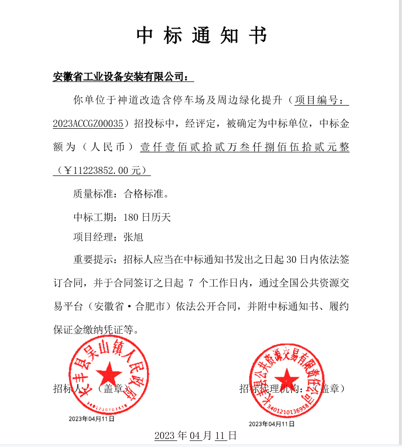 4月11日,安徽安裝市政分公司在合肥市公共資源交易平臺上投標長豐縣吳山鎮(zhèn)神道改造含停車場及周邊綠化提升項目并一舉中標,中標金額1122.38萬元。這次公招中標是分公司繼2022年8月12日廬江立人路項目中標后第二次在合肥市公招市場中標的市政類項目。