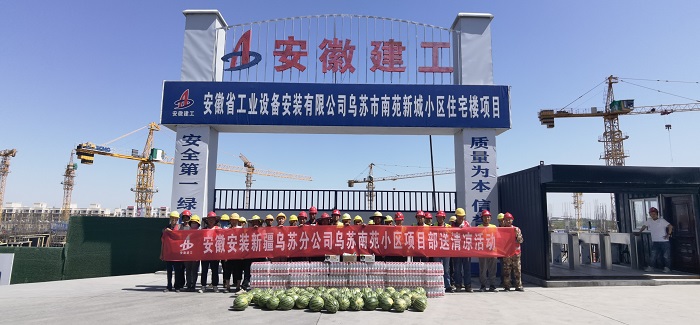6月的新疆,烈日當頭、酷暑難耐,新疆烏蘇市氣溫一度沖破38℃,給一線施工人員帶來嚴峻的“烤”驗。為了確保烏蘇市南苑新城小區(qū)住宅樓建設項目施工進度不滯后,項目部管理人員及一線工人斗烈日、戰(zhàn)酷暑,加班加點、揮汗如雨、搶抓進度。近日,新疆烏蘇分公司南苑新城項目部組織“送清涼”活動,為一線工人送去礦泉水、西瓜、綠豆、冰糖、藿香正氣水、十滴水等防暑降溫物品,并叮囑他們高溫季節(jié)施工,一定保護好自己身體。