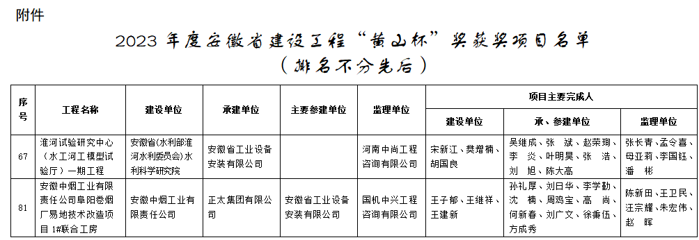 7月25日,安徽省住房和城鄉(xiāng)建設(shè)廳 、安徽省交通運(yùn)輸廳、安徽省水利廳聯(lián)合發(fā)布《關(guān)于公布2023年度安徽省建設(shè)工程“黃山杯”獎(jiǎng)獲獎(jiǎng)項(xiàng)目名單的通知》,由建工安裝集團(tuán)蚌埠分公司承建的“淮河試驗(yàn)研究中心(水工河工模型試驗(yàn)廳)一期工程”和參建的“安徽中煙工業(yè)有限責(zé)任公司阜陽(yáng)卷煙廠易地技術(shù)改造項(xiàng)目1#聯(lián)合工房”等2個(gè)項(xiàng)目均獲2023年度安徽省建筑行業(yè)建設(shè)工程質(zhì)量最高榮譽(yù)獎(jiǎng)“黃山杯”。其中“淮河試驗(yàn)研究中心(水工河工模型試驗(yàn)廳)一期工程”是建工安裝公司首次作為承建單位獲此殊榮;“安徽中煙工業(yè)有限責(zé)任公司阜陽(yáng)卷煙廠易地技術(shù)改造項(xiàng)目1#聯(lián)合工房”項(xiàng)目同時(shí)正在申報(bào)國(guó)家級(jí)安裝行業(yè)最高獎(jiǎng)項(xiàng)中國(guó)安裝工程優(yōu)質(zhì)獎(jiǎng)(安裝之星),5月份預(yù)檢已通過(guò),等待9月復(fù)檢。兩個(gè)項(xiàng)目作為承建和參建單位一舉捧得2樽“黃山杯”,也是蚌埠分公司歷史首次,同時(shí)也是蚌埠分公司近年來(lái)捧得的第5、第6樽“黃山杯”獎(jiǎng)項(xiàng)。