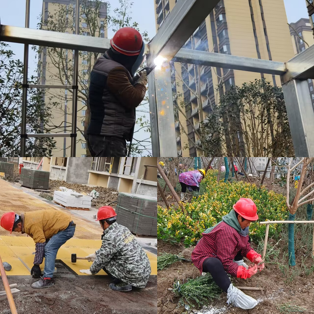 圖為:舒城縣青墩小區(qū)項(xiàng)目坡道鋼結(jié)構(gòu)雨棚焊接、人行道鋪裝及綠化種植施工