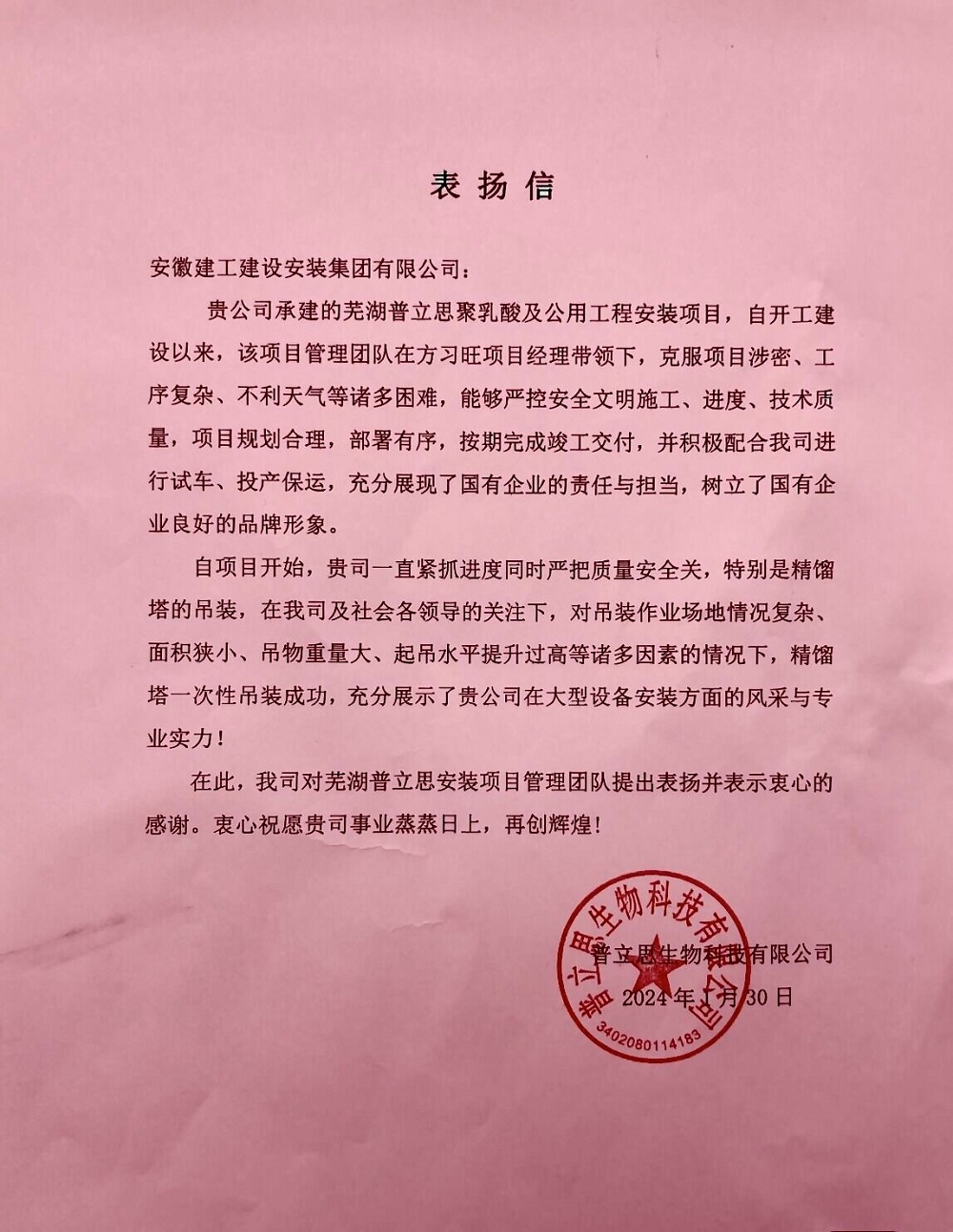 近日,建工安裝蕪湖普立思聚乳酸及公用工程安裝項(xiàng)目收到業(yè)主表揚(yáng)信,對(duì)項(xiàng)目團(tuán)隊(duì)在項(xiàng)目建設(shè)過程中主動(dòng)作為、攻堅(jiān)克難,敢于擔(dān)當(dāng)、全力拼搏的精神予以充分肯定和高度認(rèn)可,對(duì)公司及項(xiàng)目全體參建人員的辛苦付出和不懈努力表示衷心感謝和誠摯問候。