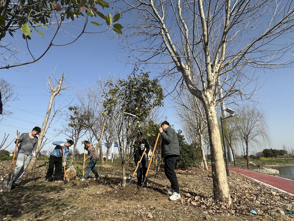 植樹(shù)現(xiàn)場(chǎng),團(tuán)員青年們熱情高漲、干勁十足。大家通力協(xié)作、揮鍬鏟土、踏土夯苗、提水澆灌,忙的不亦樂(lè)乎。經(jīng)過(guò)一番辛勤勞動(dòng),多株翠綠的樹(shù)苗迎風(fēng)而立,一片勃勃生機(jī)的景象,為河岸再添新綠。
