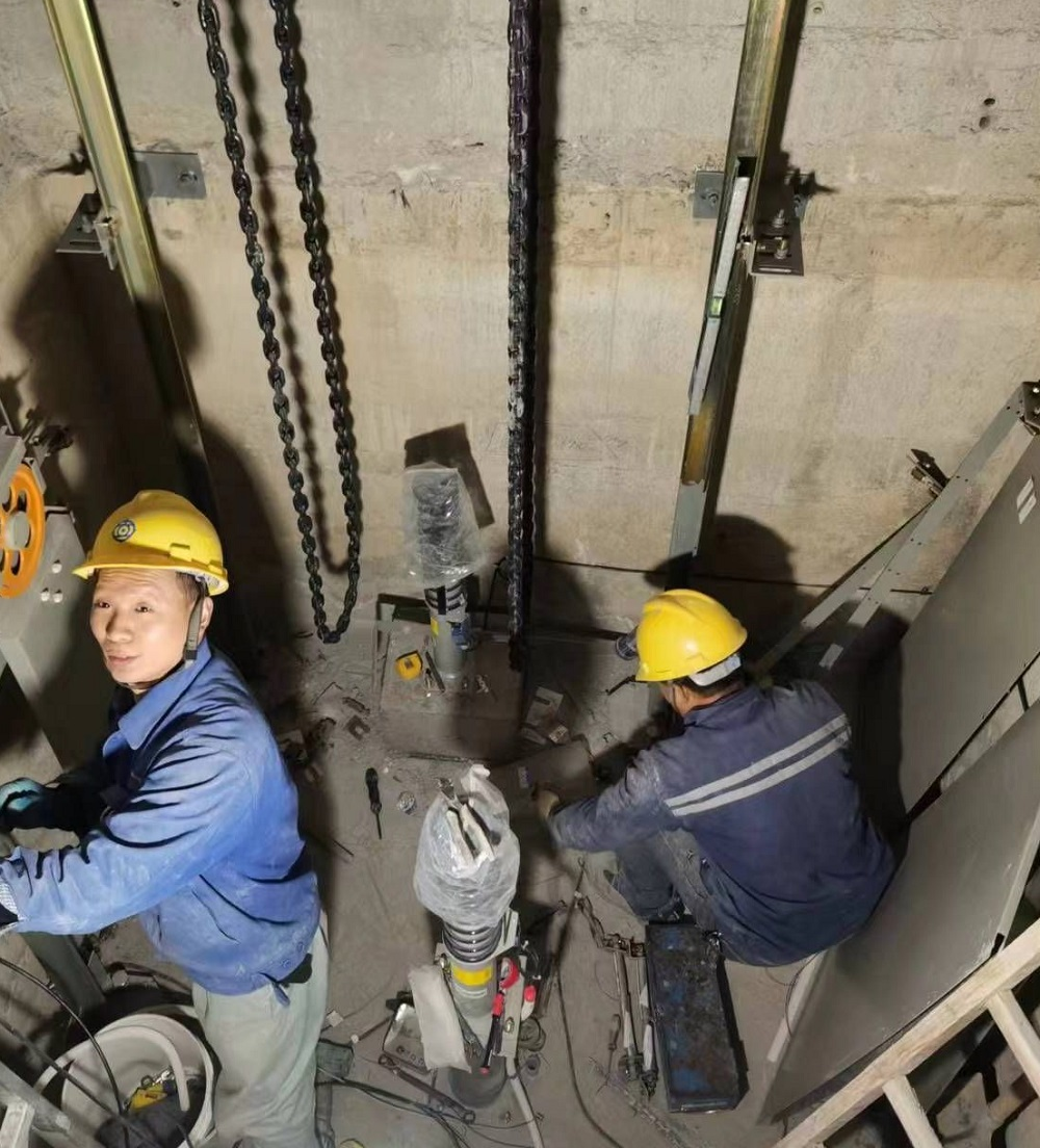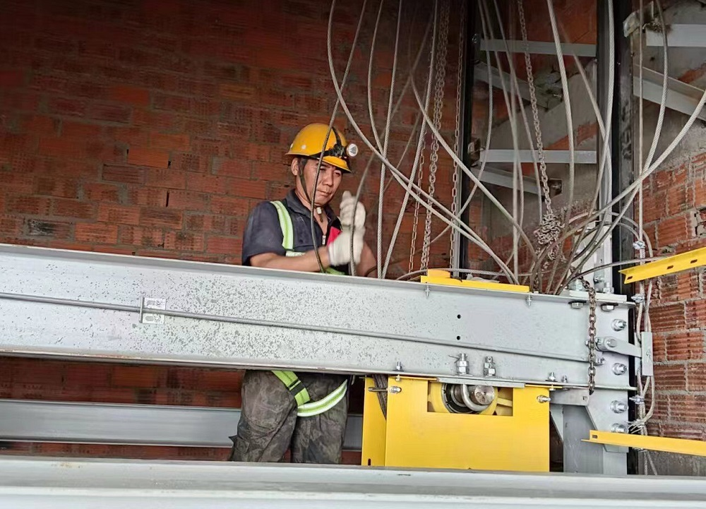 長三角一體化中新蘇滁高新區(qū)高端智能制造產(chǎn)研基地項目現(xiàn)場安裝人員正在收緊鋼絲繩、調整電梯緩沖距離