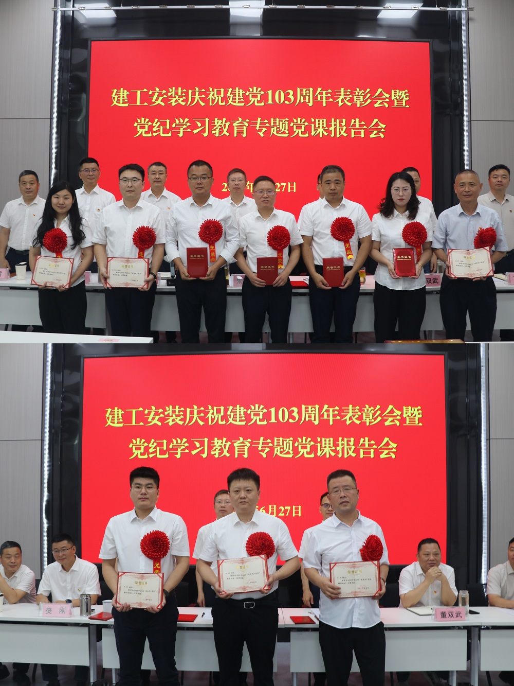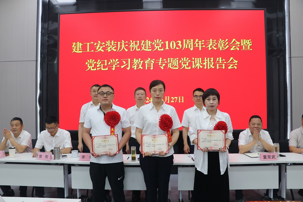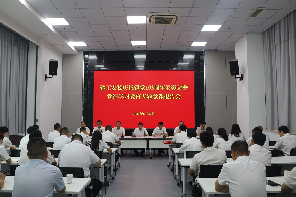 為慶祝中國(guó)共產(chǎn)黨成立103周年,扎實(shí)推進(jìn)黨紀(jì)學(xué)習(xí)教育走深走實(shí)。6月27日上午,建工安裝黨委召開(kāi)慶祝建黨103周年表彰會(huì)暨黨紀(jì)學(xué)習(xí)教育專(zhuān)題黨課報(bào)告會(huì)。公司領(lǐng)導(dǎo)班子成員出席會(huì)議,會(huì)議由公司黨委副書(shū)記、副總經(jīng)理周正平主持。