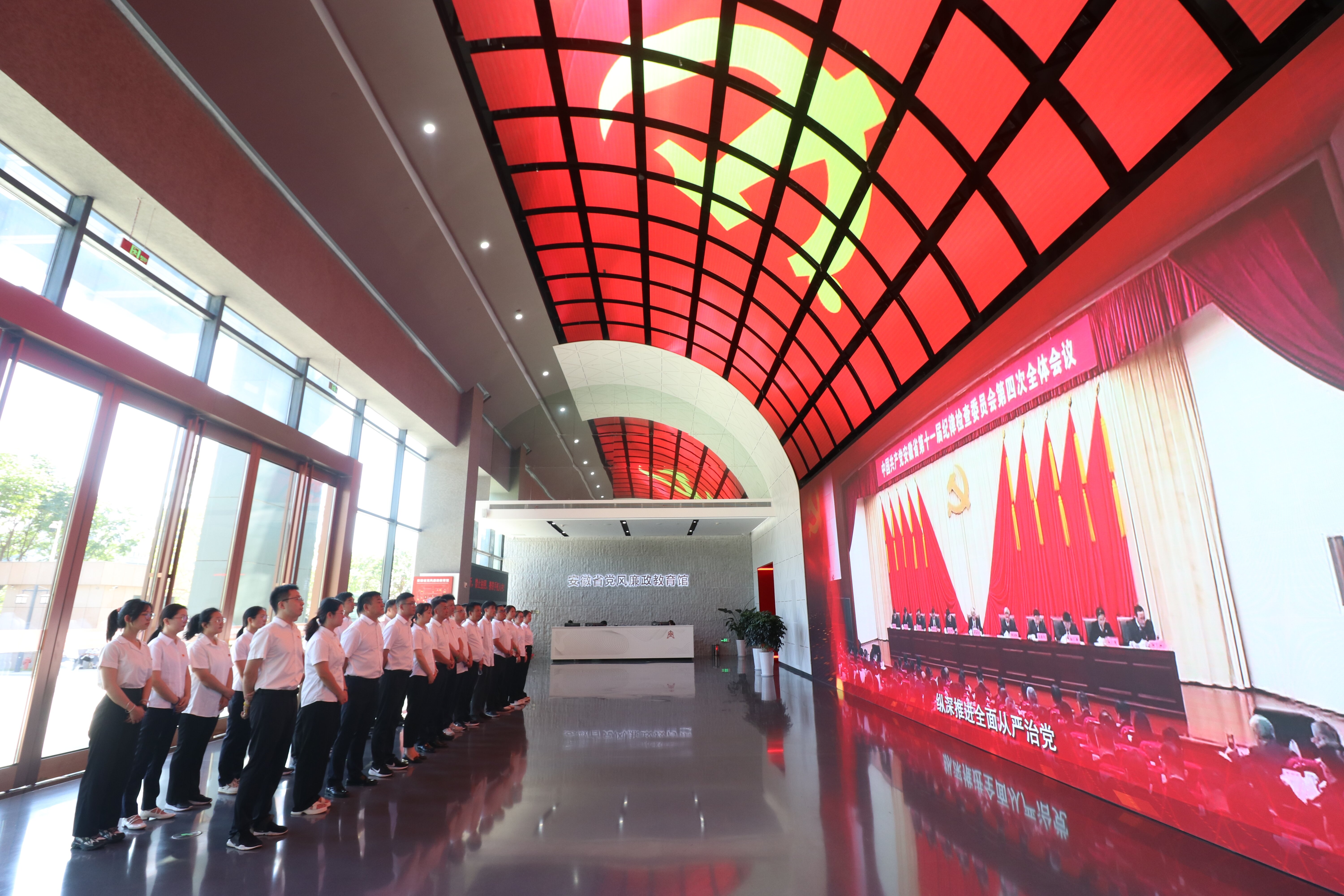 進入教育館,全體人員集中觀看了《永遠在路上》專題片。隨后,依次參觀了“紀律立黨·從嚴治黨”“廉潤江淮·清風(fēng)揚帆”“以案為鑒·警鐘長鳴”“不忘初心·永葆清廉”四個展廳。跟隨著講解員的步伐,通過聆聽講解、觀看視頻圖片、場景還原、體驗空間等形式,全方位學(xué)習(xí)回顧了建黨百年來的紀律建設(shè)史,以及安徽省委落實全面從嚴治黨、深入開展黨風(fēng)廉政建設(shè)和反腐敗斗爭的豐碩成果。一組組觸目驚心的數(shù)字、一幕幕聲淚俱下的懺悔、一段段發(fā)人深省的旁白,令參觀的黨員干部職工受警醒、明底線、知敬畏。參觀結(jié)束后,全體黨員面向黨旗,舉起右手,莊嚴宣誓,重溫入黨時的承諾,在鏗鏘有力的宣誓聲中回望初心使命。本次活動大家還集中觀看了30分鐘警示教育片。