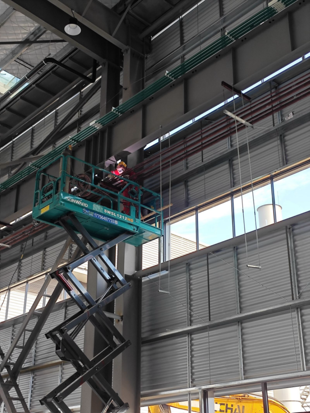 建工安裝合肥分公司施工內(nèi)容涉及2#重鋼車間主次構(gòu)安裝、圍護(hù)系統(tǒng)、門窗、防火涂料、通風(fēng)氣樓和機電安裝工程(裝飾裝修、工藝管線、消防、給排水、電氣、通風(fēng)空調(diào)等)。為保質(zhì)保量完成施工任務(wù),分公司派駐分管領(lǐng)導(dǎo)現(xiàn)場駐點,項目管理團(tuán)隊日夜跟進(jìn),施工人數(shù)達(dá)到100多人,曲臂車、登高車等各種現(xiàn)場施工機械達(dá)60余輛。本項目留給機電安裝工期緊任務(wù)重,項目全體人員日夜奮戰(zhàn),最終刷新15日大面完工耀眼戰(zhàn)績,為基地順利投產(chǎn)奠定堅實基礎(chǔ)。