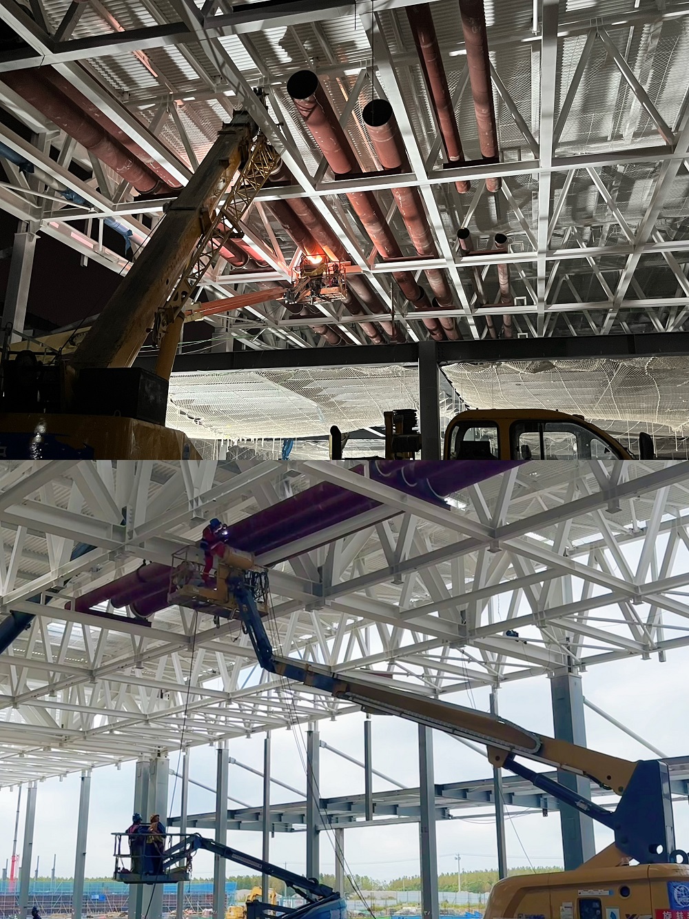 該項(xiàng)目本階段正在進(jìn)行各車間直徑DN700、DN800的空調(diào)冷凍水管道吊裝搶工。為了能早日完成空調(diào)冷凍水管道吊裝的工程節(jié)點(diǎn)目標(biāo),項(xiàng)目管理人員以工期進(jìn)度為主線,多次召開(kāi)技術(shù)商討會(huì),合理優(yōu)化吊裝施工方案,全體員工實(shí)行24小時(shí)輪班工作制,夜晚輪流值班,晝夜奮戰(zhàn)、奮勇?tīng)?zhēng)先,發(fā)起項(xiàng)目加速建設(shè)的“最強(qiáng)攻勢(shì)”。