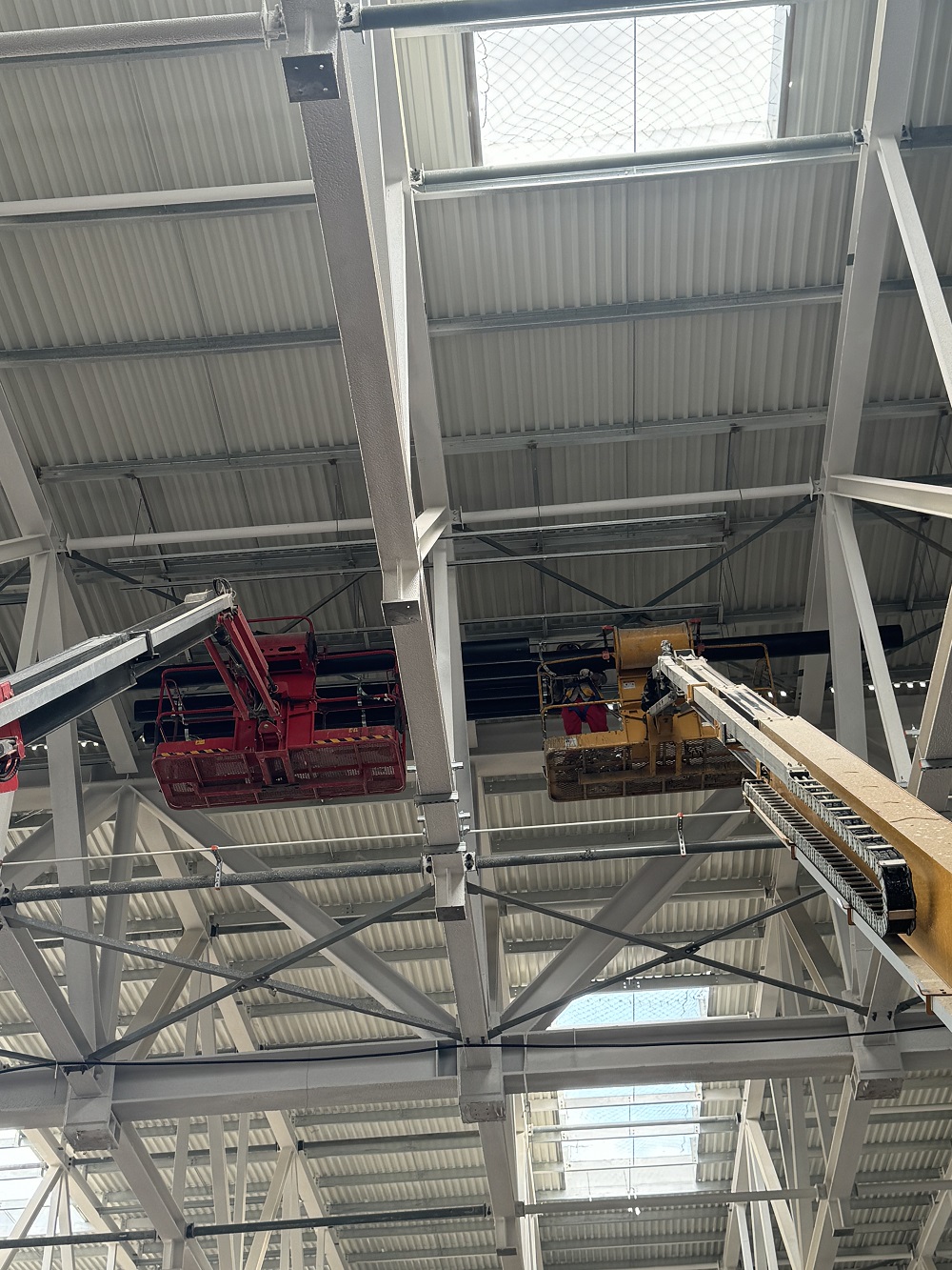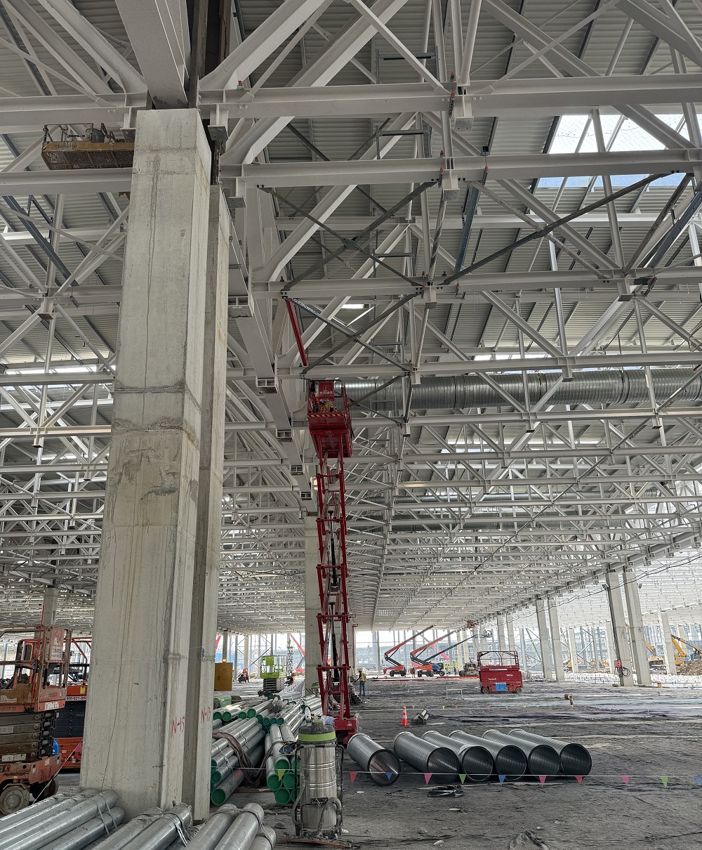 目前正在進行車間一1-6區(qū)通風(fēng)管、照明管、橋架、虹吸雨水管、衛(wèi)生間排水管、防雷接地、消防管等安裝作業(yè),材料加工區(qū)預(yù)制各類管道支架也在同步推進?,F(xiàn)已完成車間一風(fēng)管安裝約3000平方米,風(fēng)管預(yù)制約8000平方米,虹吸雨水管道安裝約120米,照明配管安裝約2000米,消防管道安裝約320米,防雷接地網(wǎng)安裝約10000米,橋架安裝約400米。