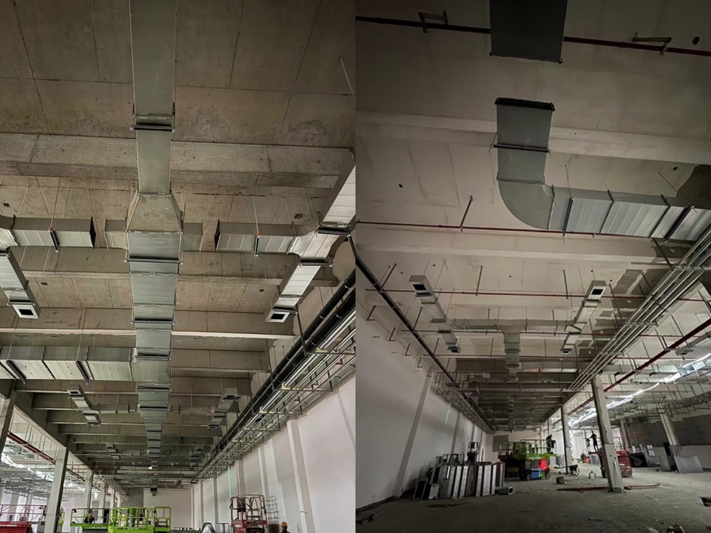 目前,焊裝車(chē)間循環(huán)水系統(tǒng)、消火栓系統(tǒng)、給排水系統(tǒng)、壓縮空氣已完成全部管道安裝任務(wù),進(jìn)入吹掃試驗(yàn)階段。電氣系統(tǒng)進(jìn)入電纜放線和柜體箱體安裝階段,暖通系統(tǒng)進(jìn)入屋頂閣樓安裝階段。