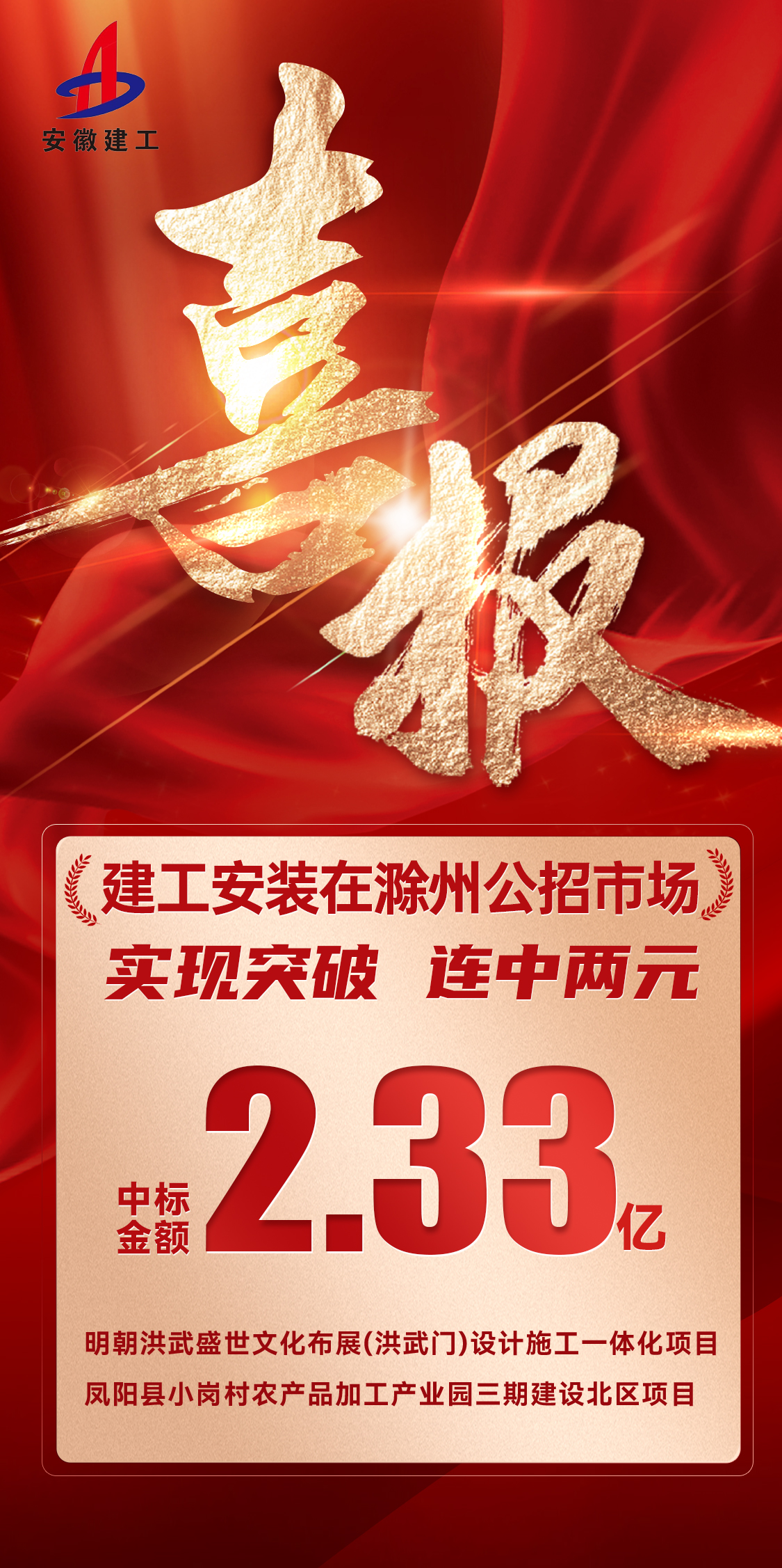 近日,建工安裝連中兩標(biāo),成功攬獲明朝洪武盛世文化布展(洪武門)設(shè)計(jì)施工一體化項(xiàng)目以及鳳陽(yáng)縣小崗村農(nóng)產(chǎn)品加工產(chǎn)業(yè)園三期建設(shè)北區(qū)項(xiàng)目,中標(biāo)金額2.33億元,在滁州屬地市場(chǎng)實(shí)現(xiàn)新突破。