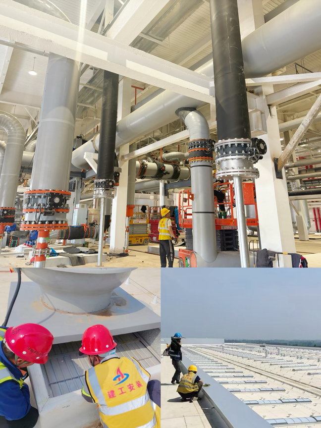 圖為新橋智能制造產(chǎn)業(yè)園項(xiàng)目部冷凍水管道保溫、屋面風(fēng)機(jī)調(diào)試、TPO屋面防雷接地施工