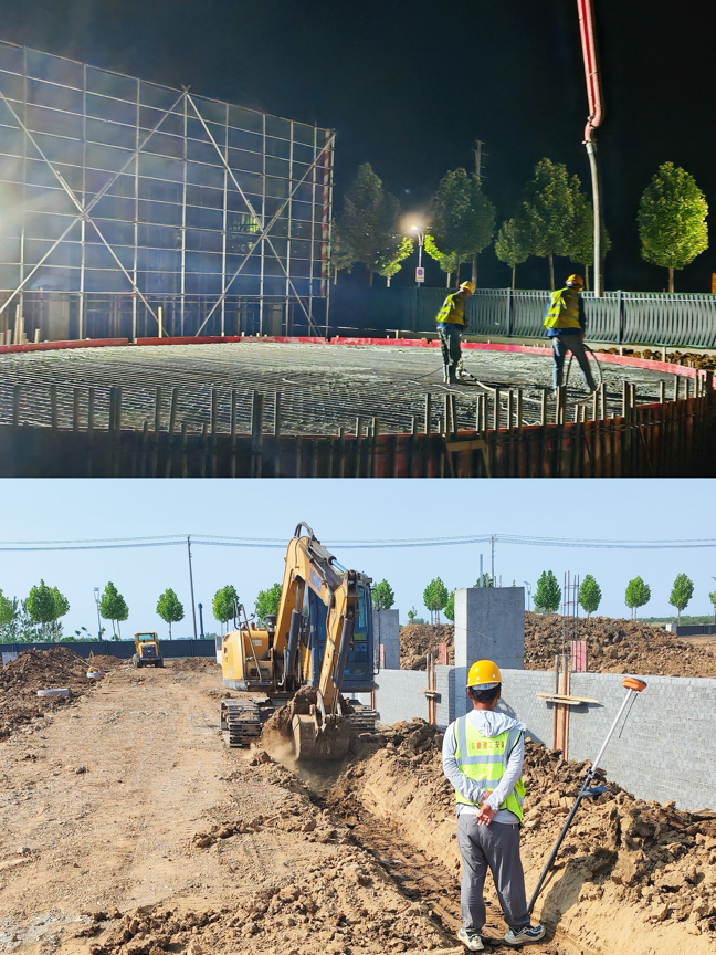 圖為明光科順涂料智能化生產(chǎn)基地項(xiàng)目筏板基礎(chǔ)混凝土澆筑、管道溝槽開(kāi)挖